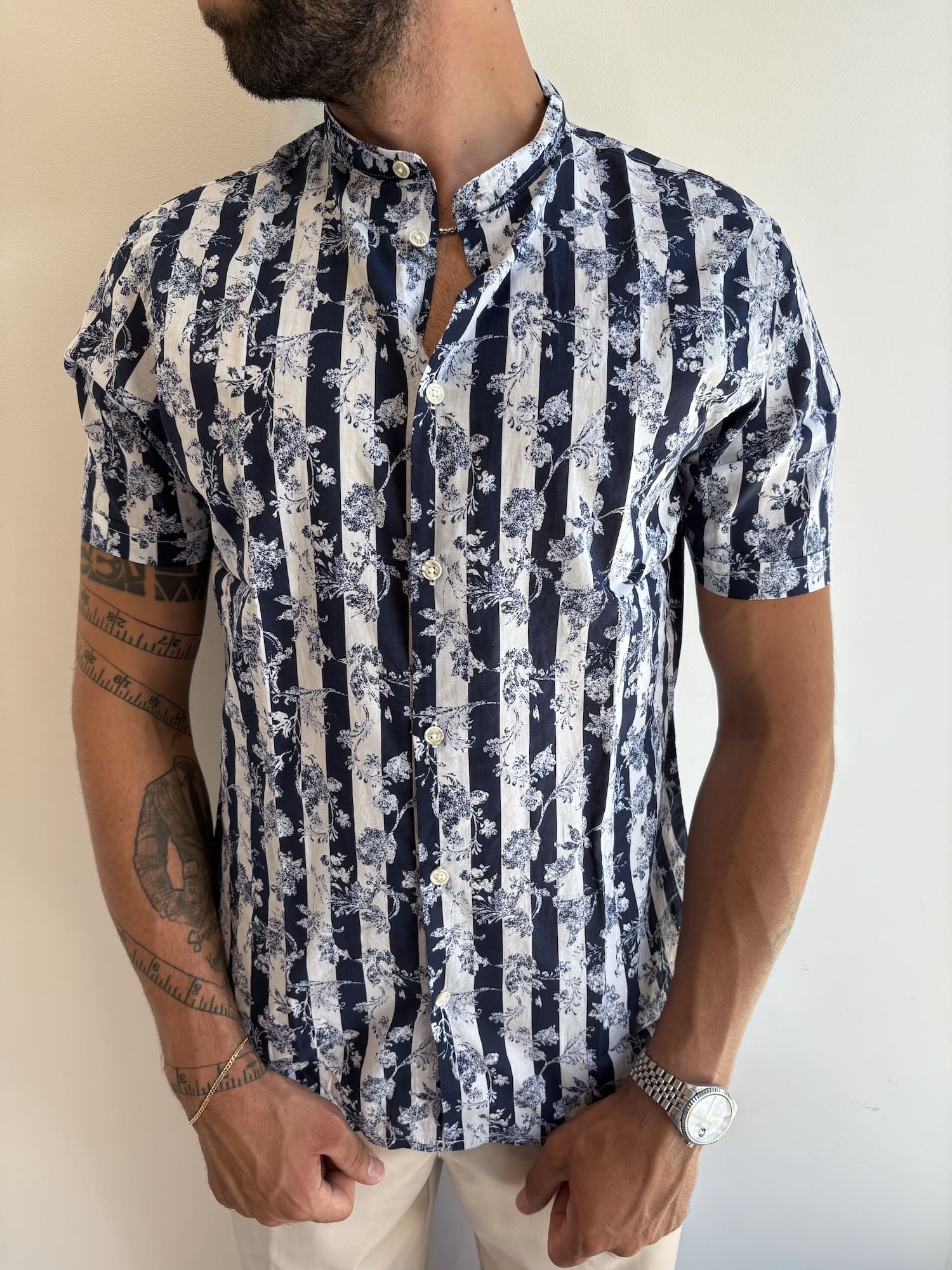Camicia maniche corte a righe e fantasia floreale