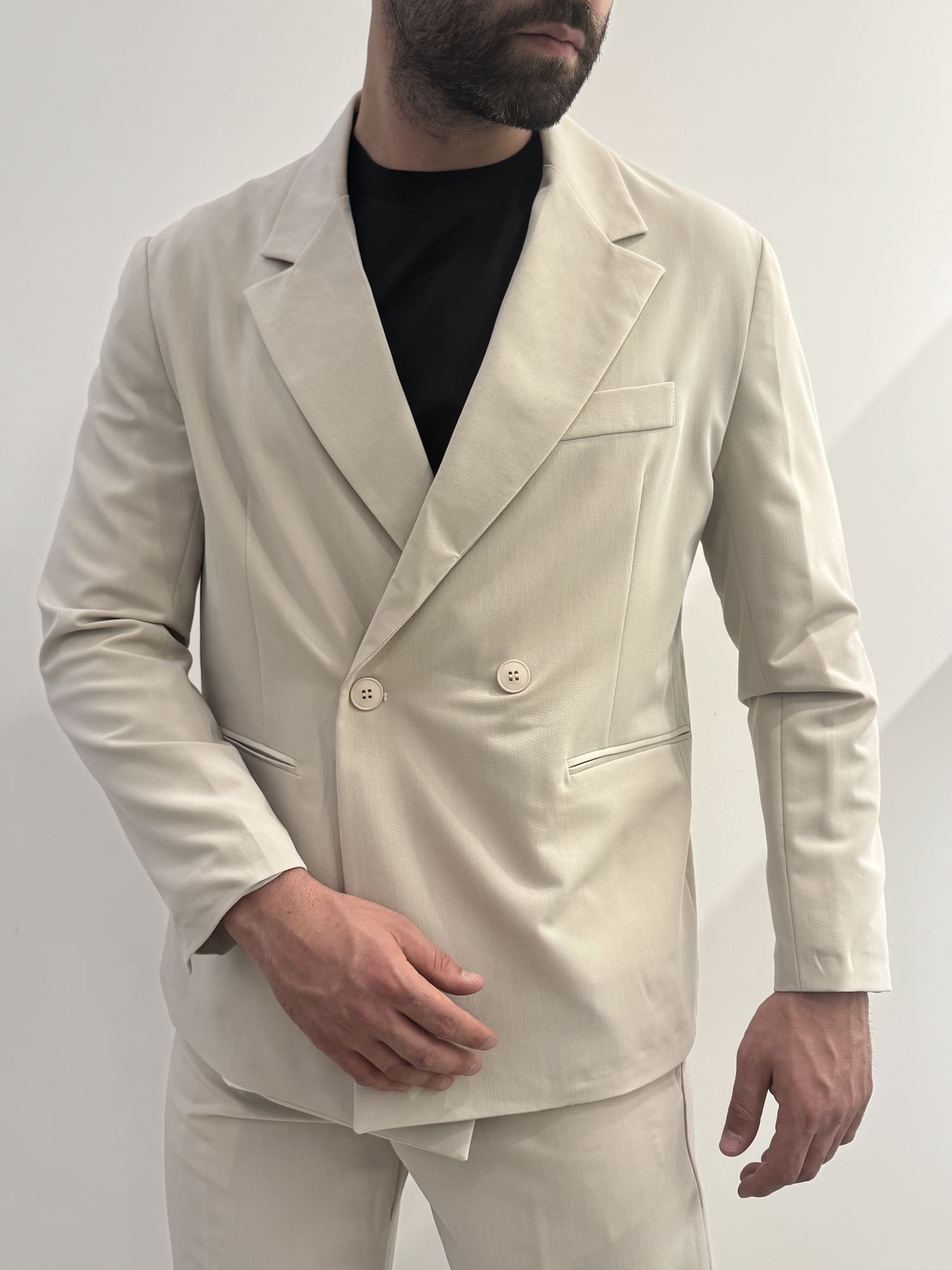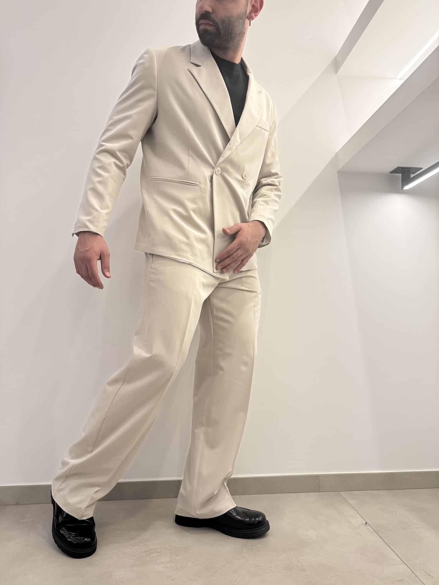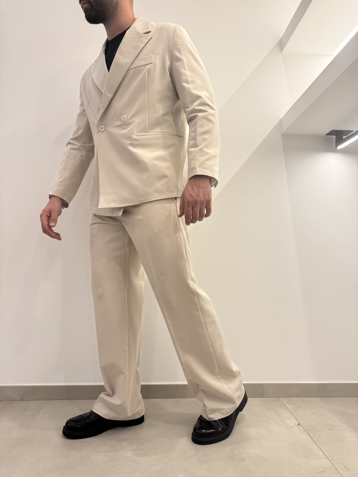 Abito doppio petto con vestibilità baggy in poli viscosa con molla sulla zona lombare del pantalone, elegante e versatile.