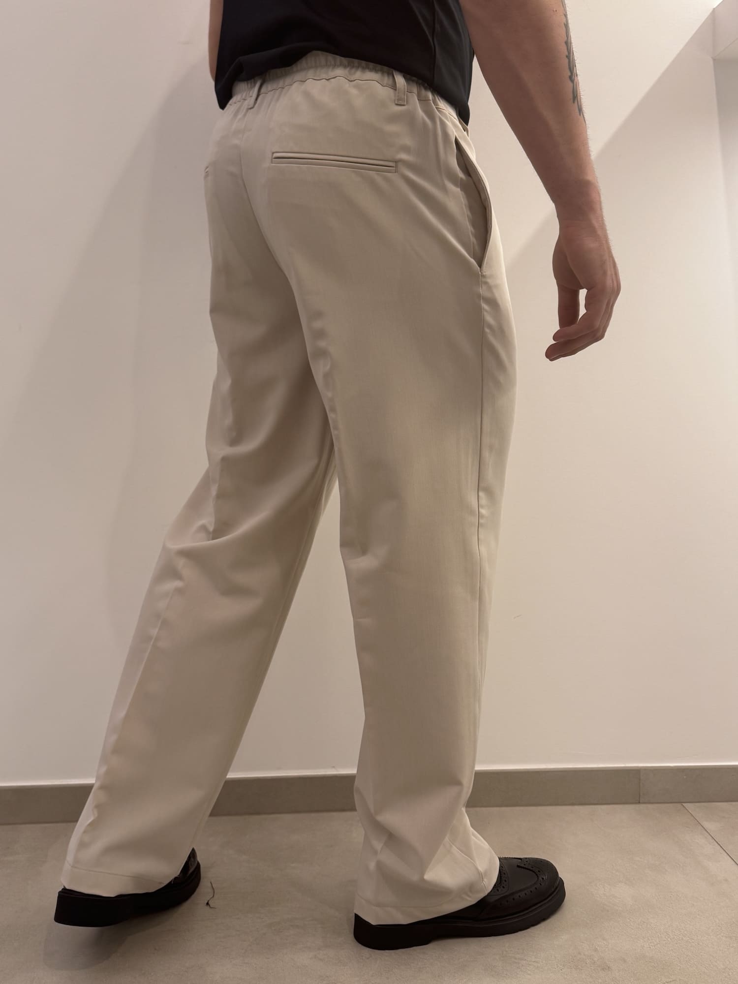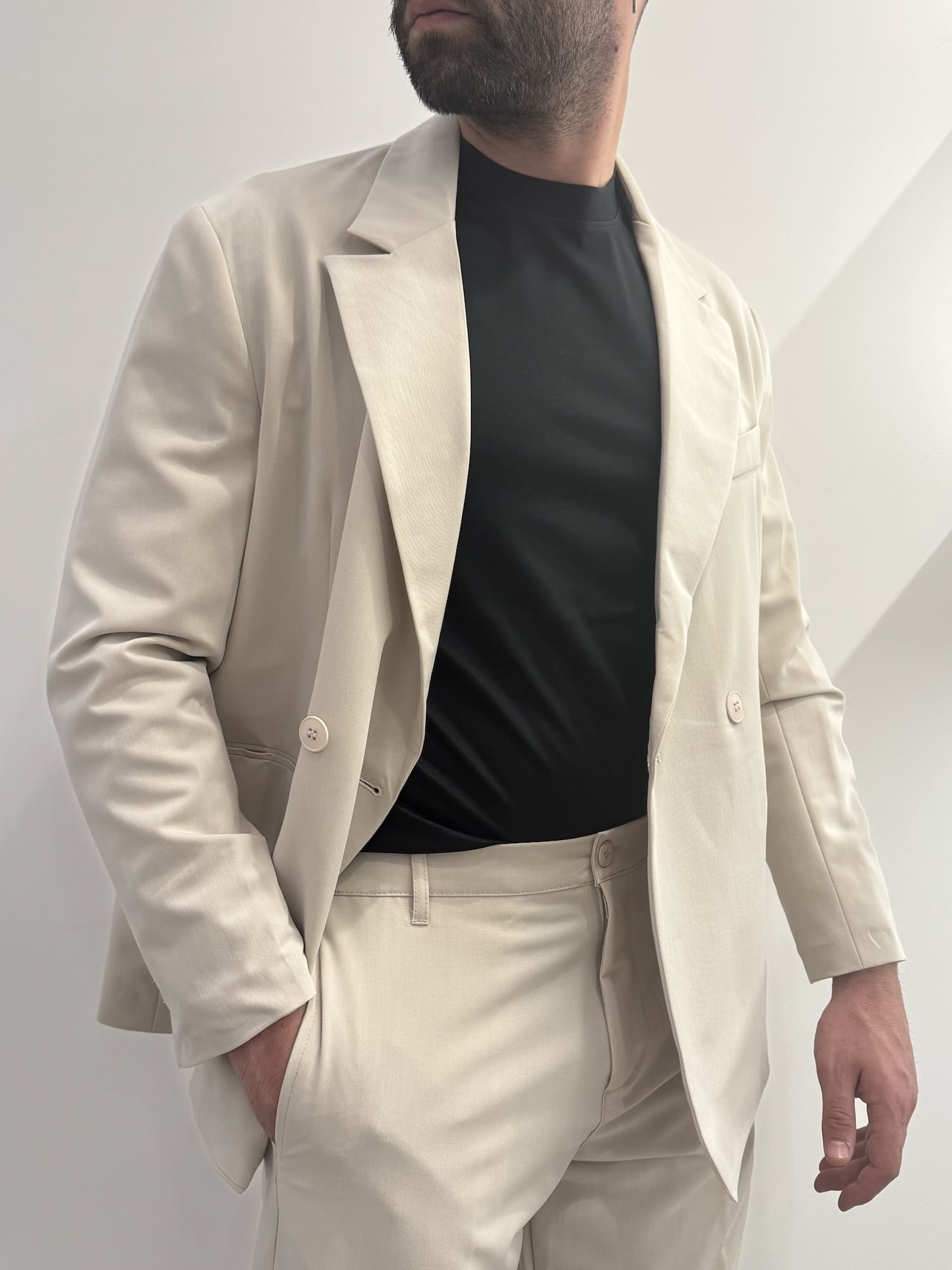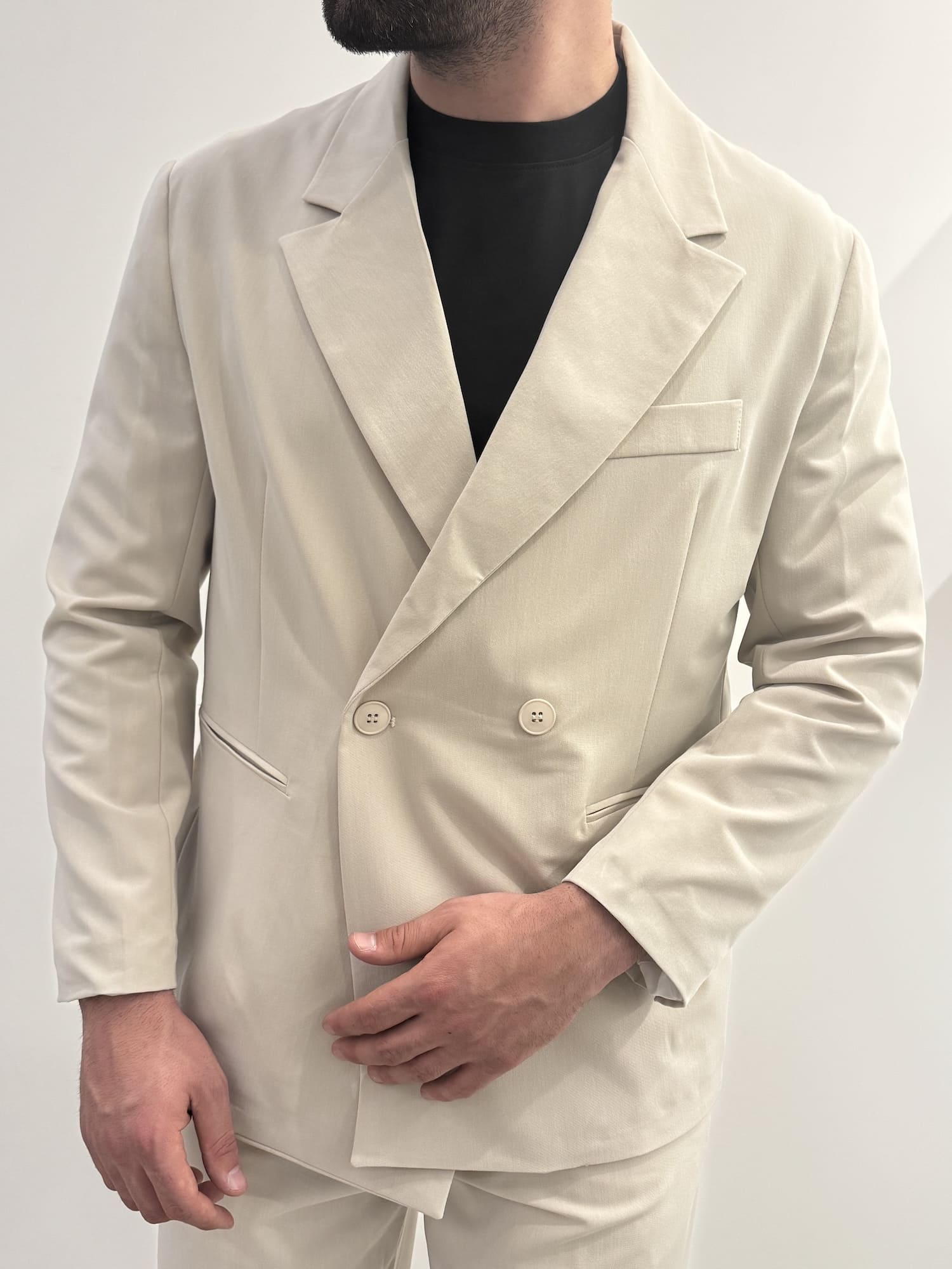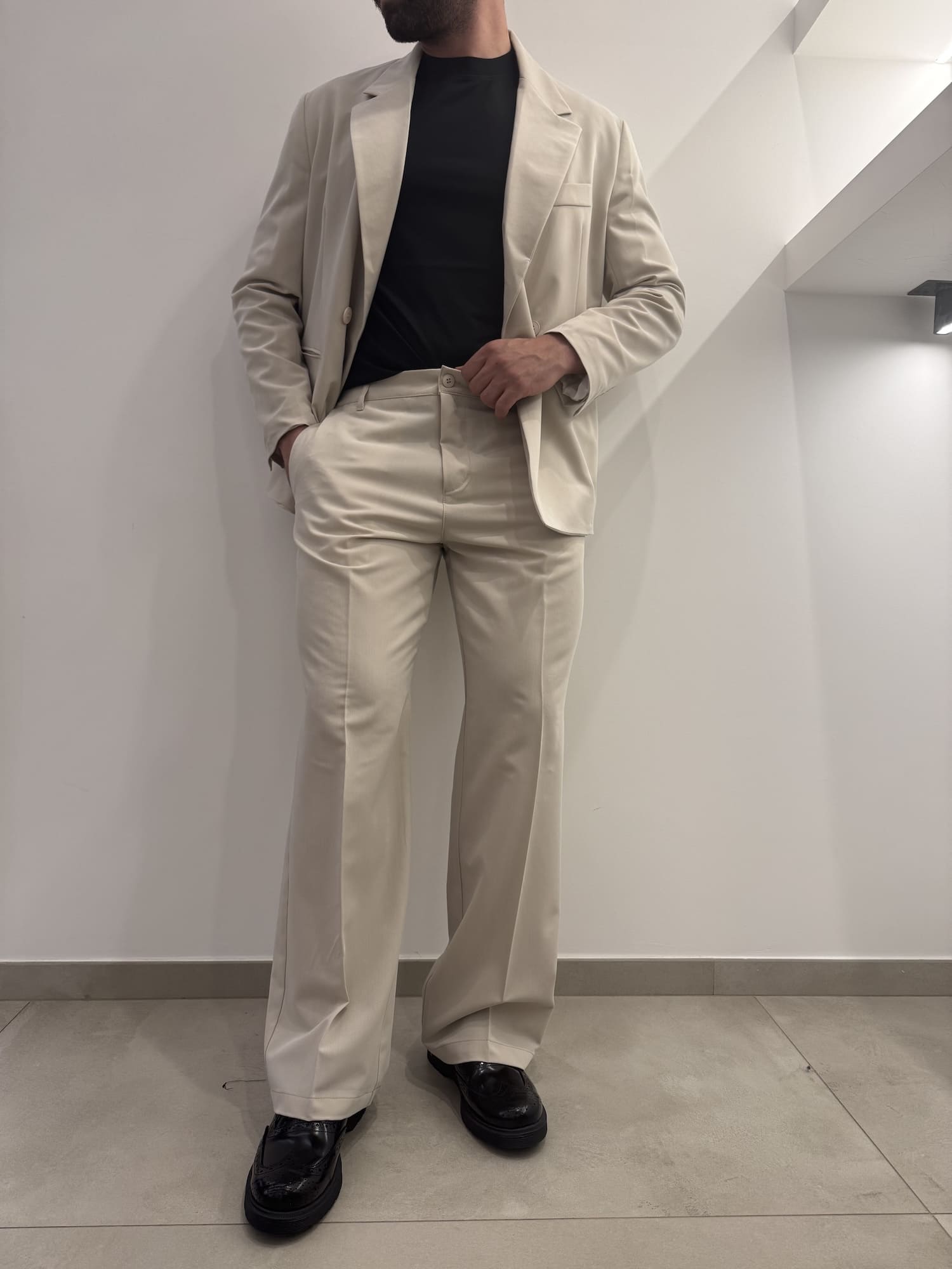 Abito doppio petto con vestibilità baggy in poli viscosa con molla sulla zona lombare del pantalone, elegante e versatile.