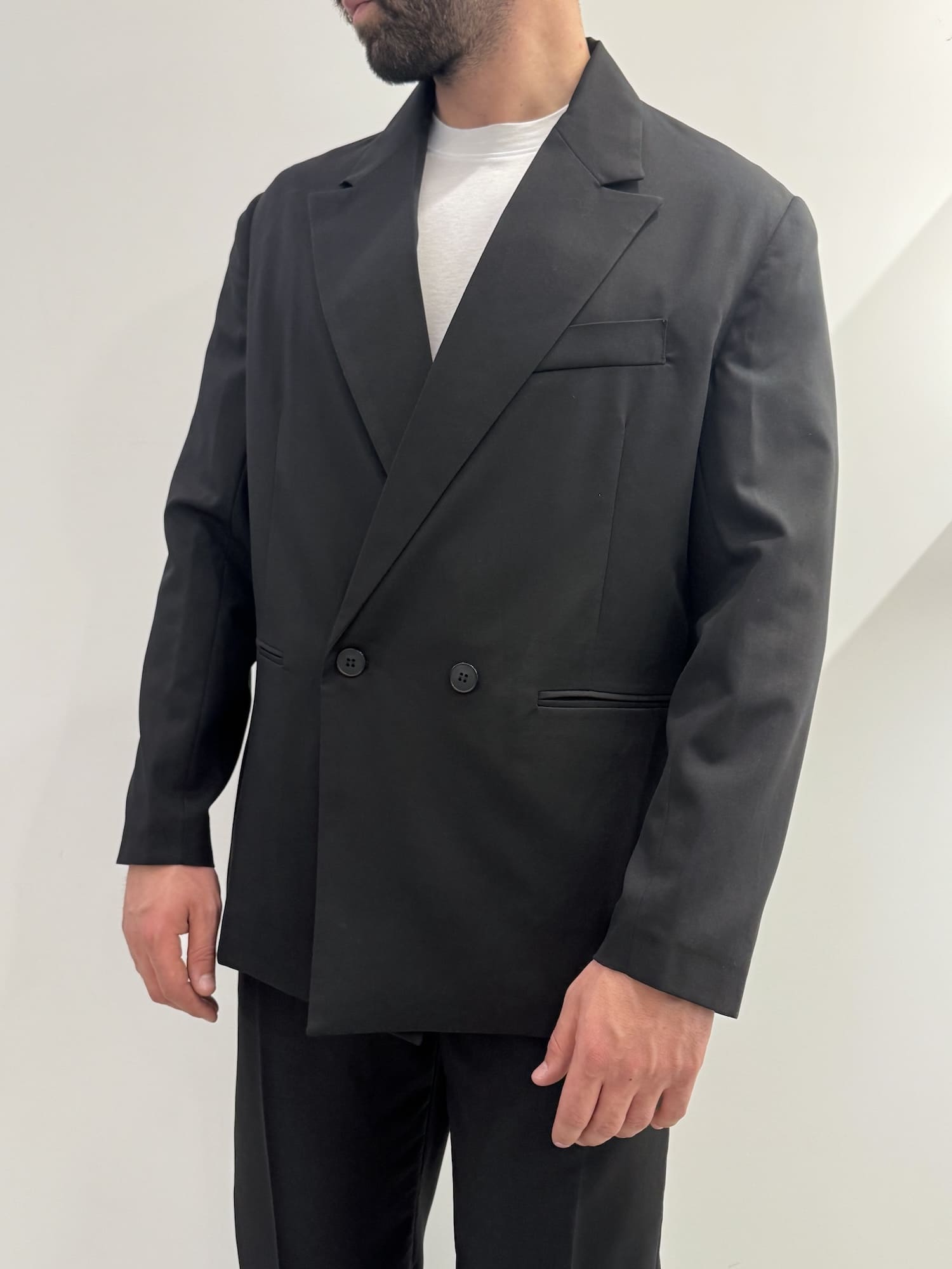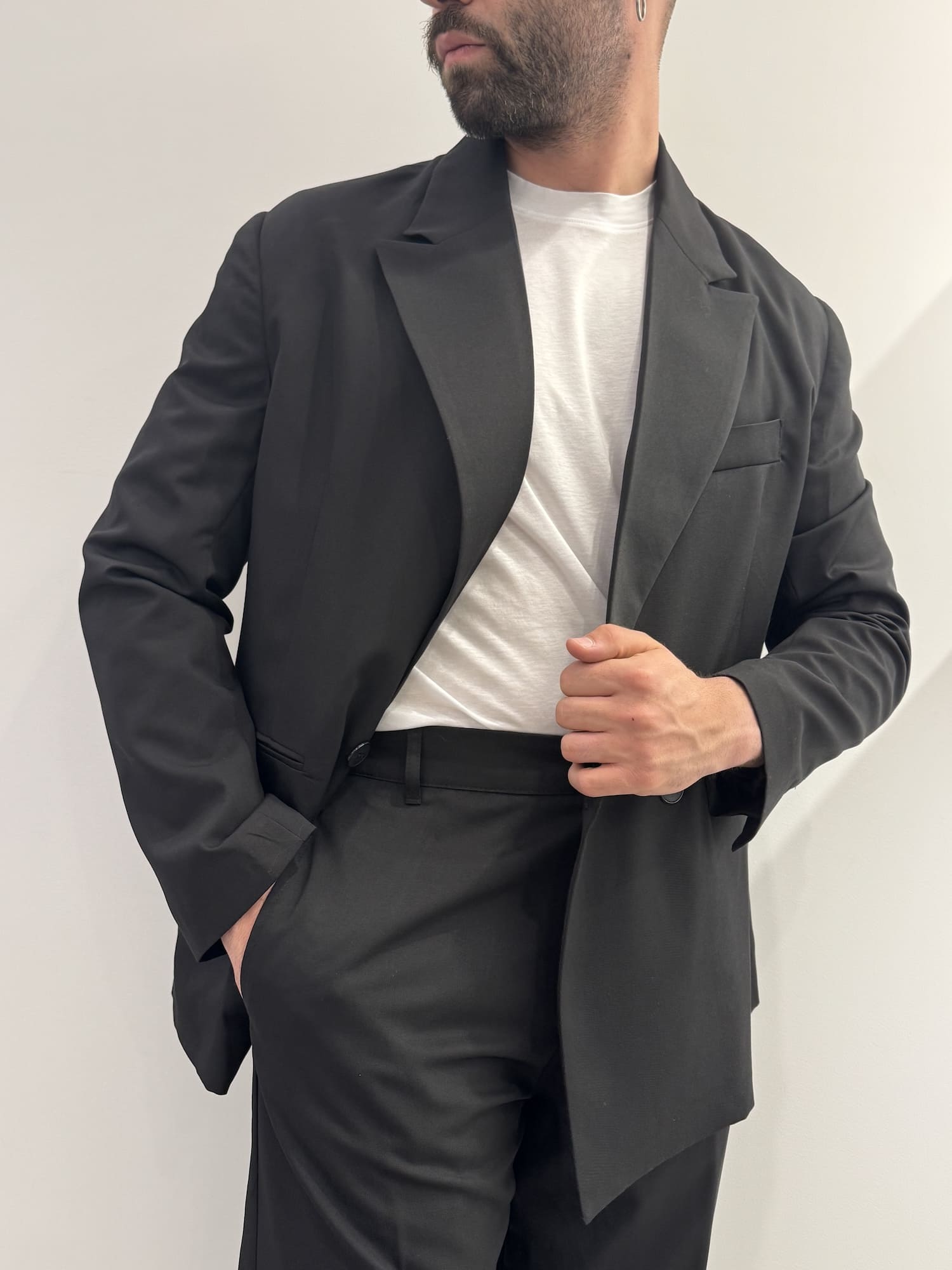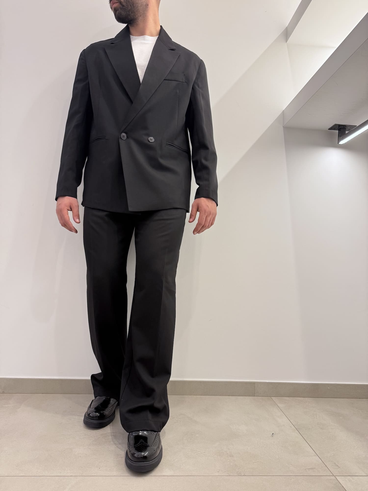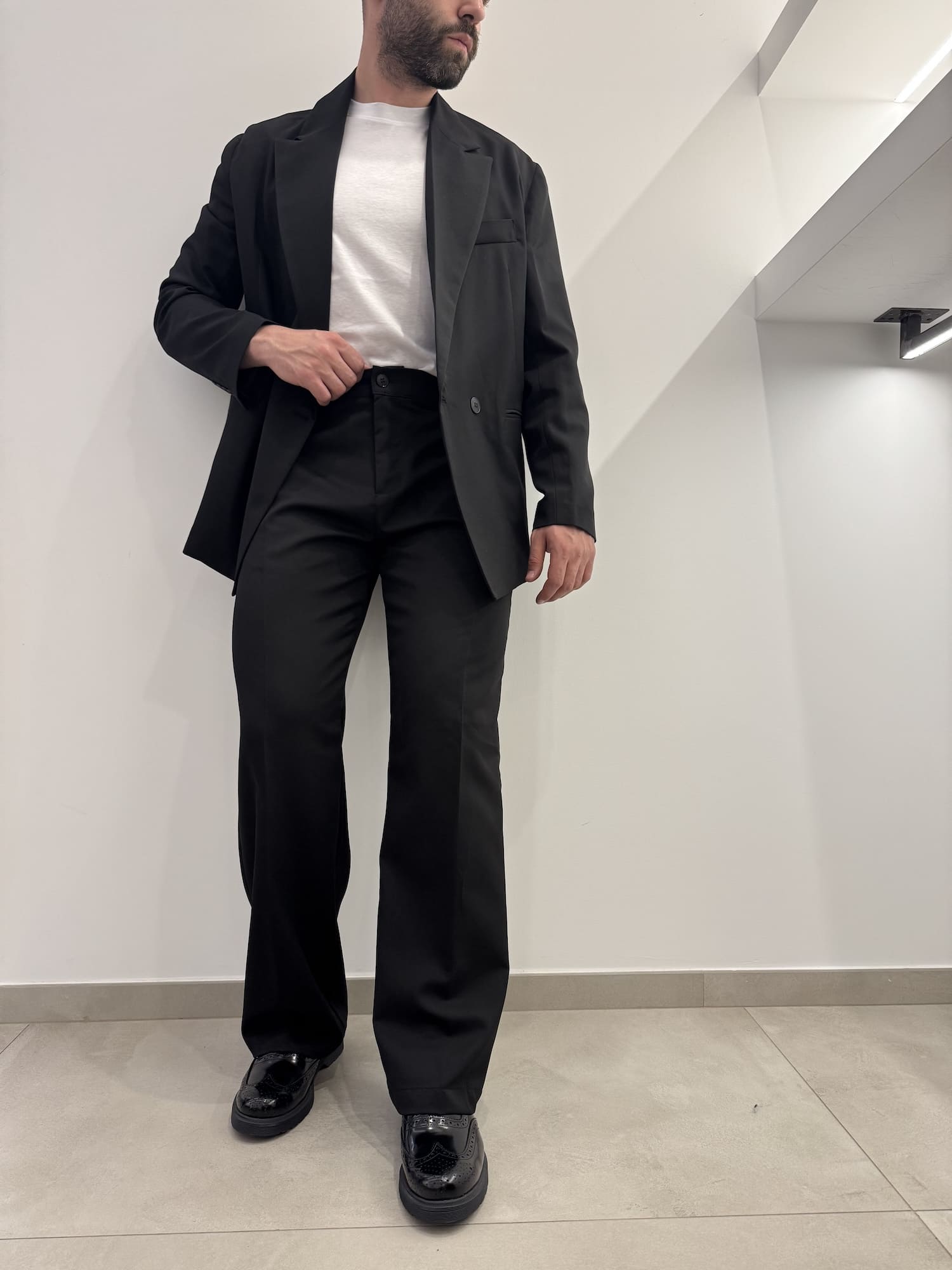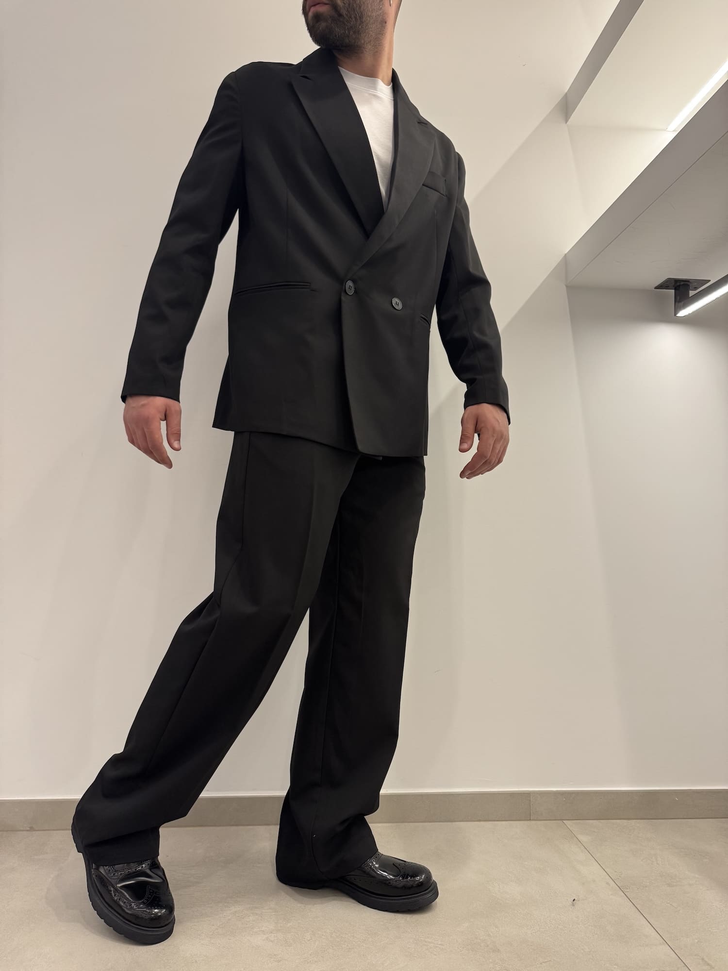 Abito doppio petto con vestibilità baggy in poli viscosa con molla sulla zona lombare del pantalone, elegante e versatile.