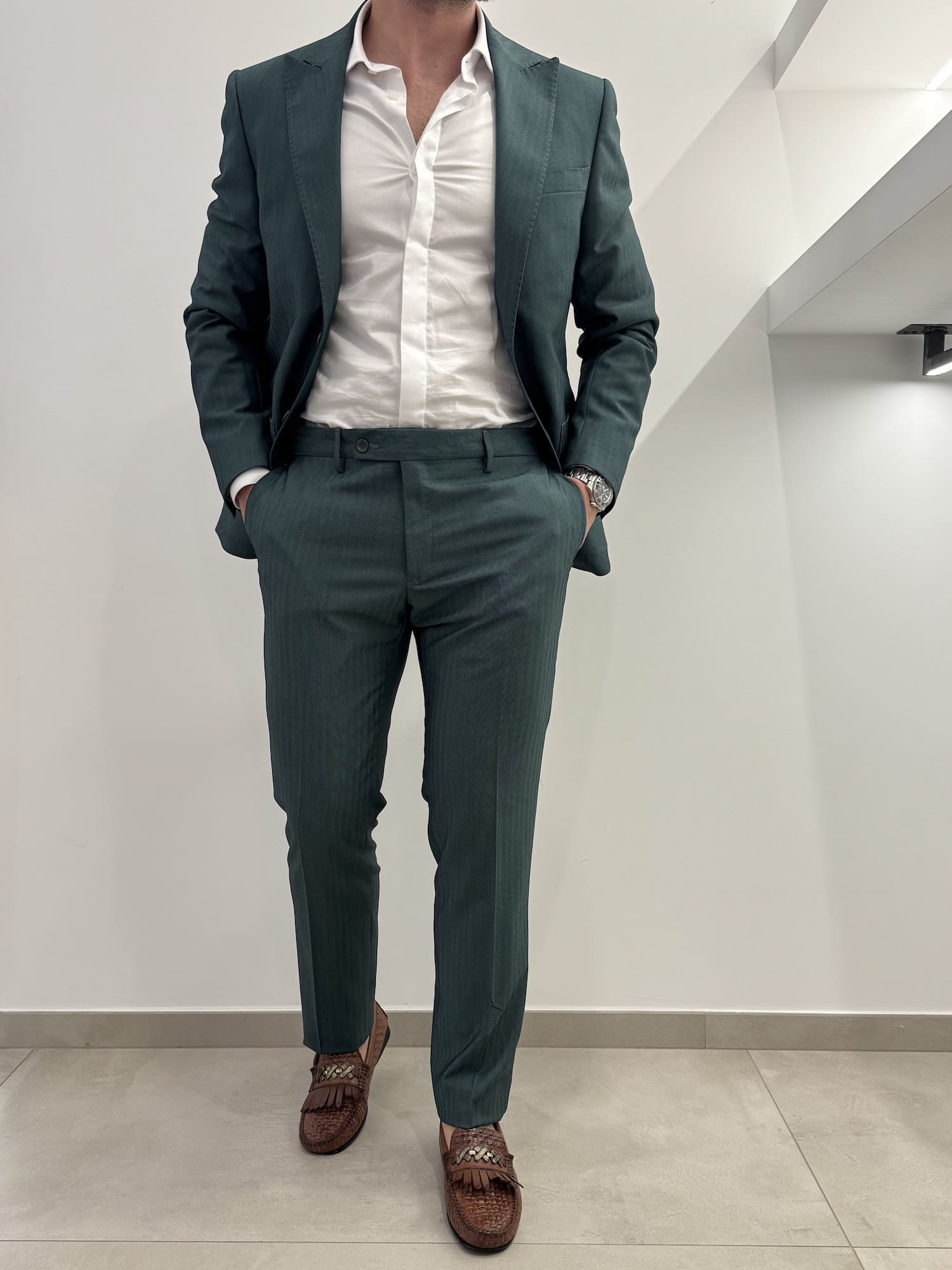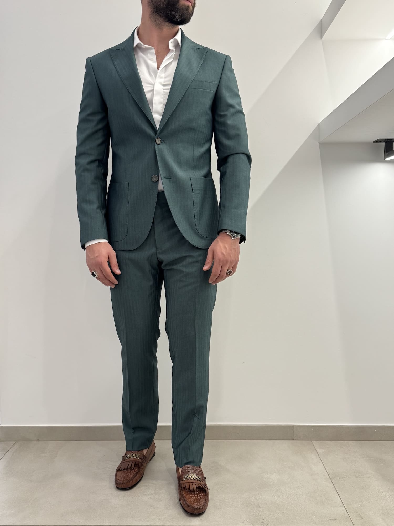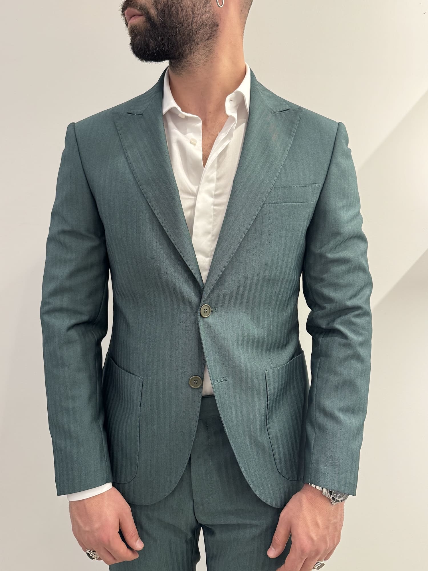 Abito slim uomo in tessuto Solaro ( poli-viscosa ) Giacca con tasche a toppa e pantalone con bottone decentrato.