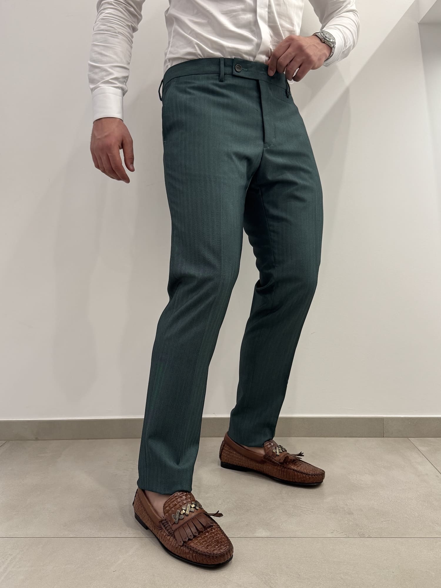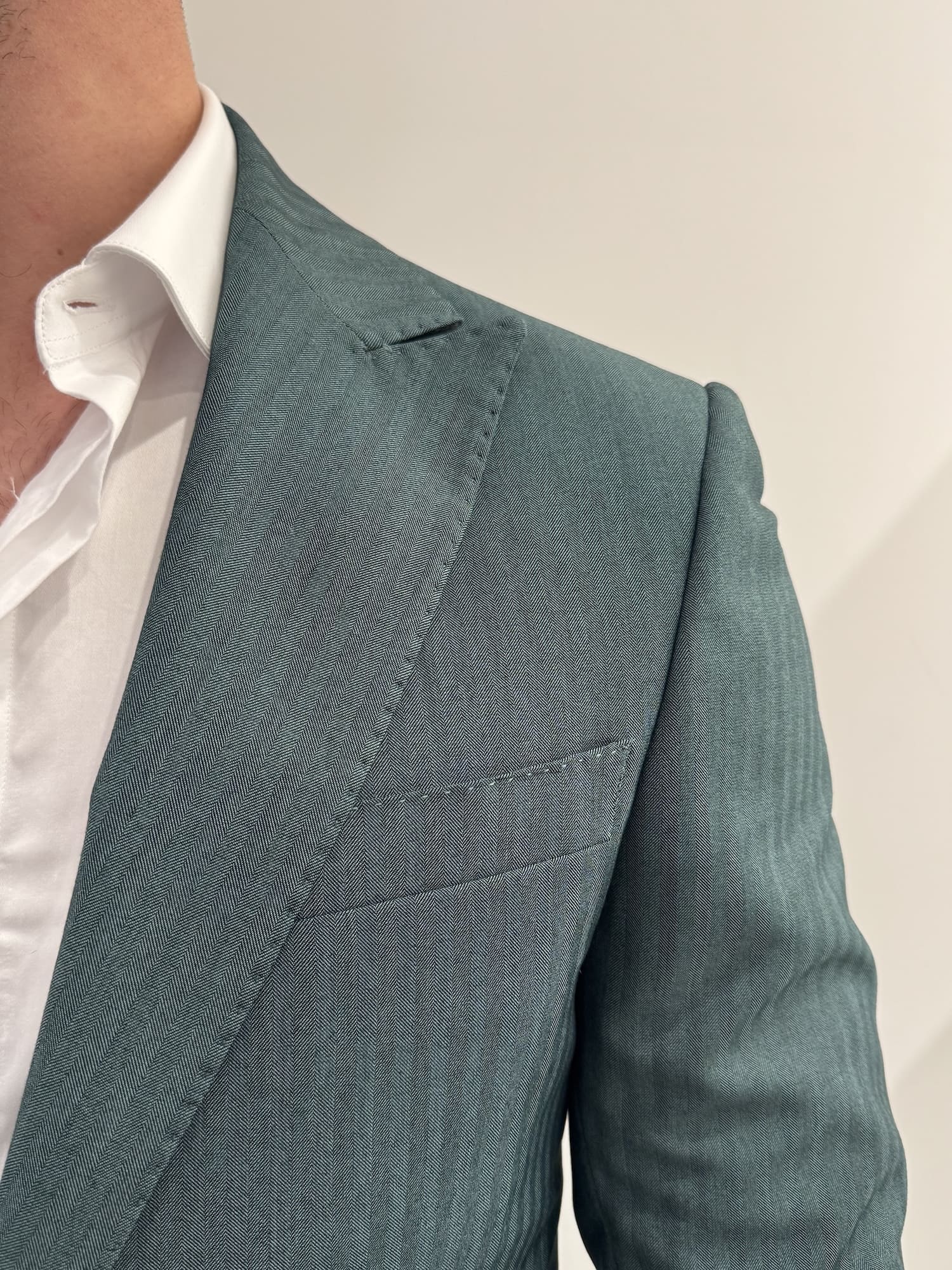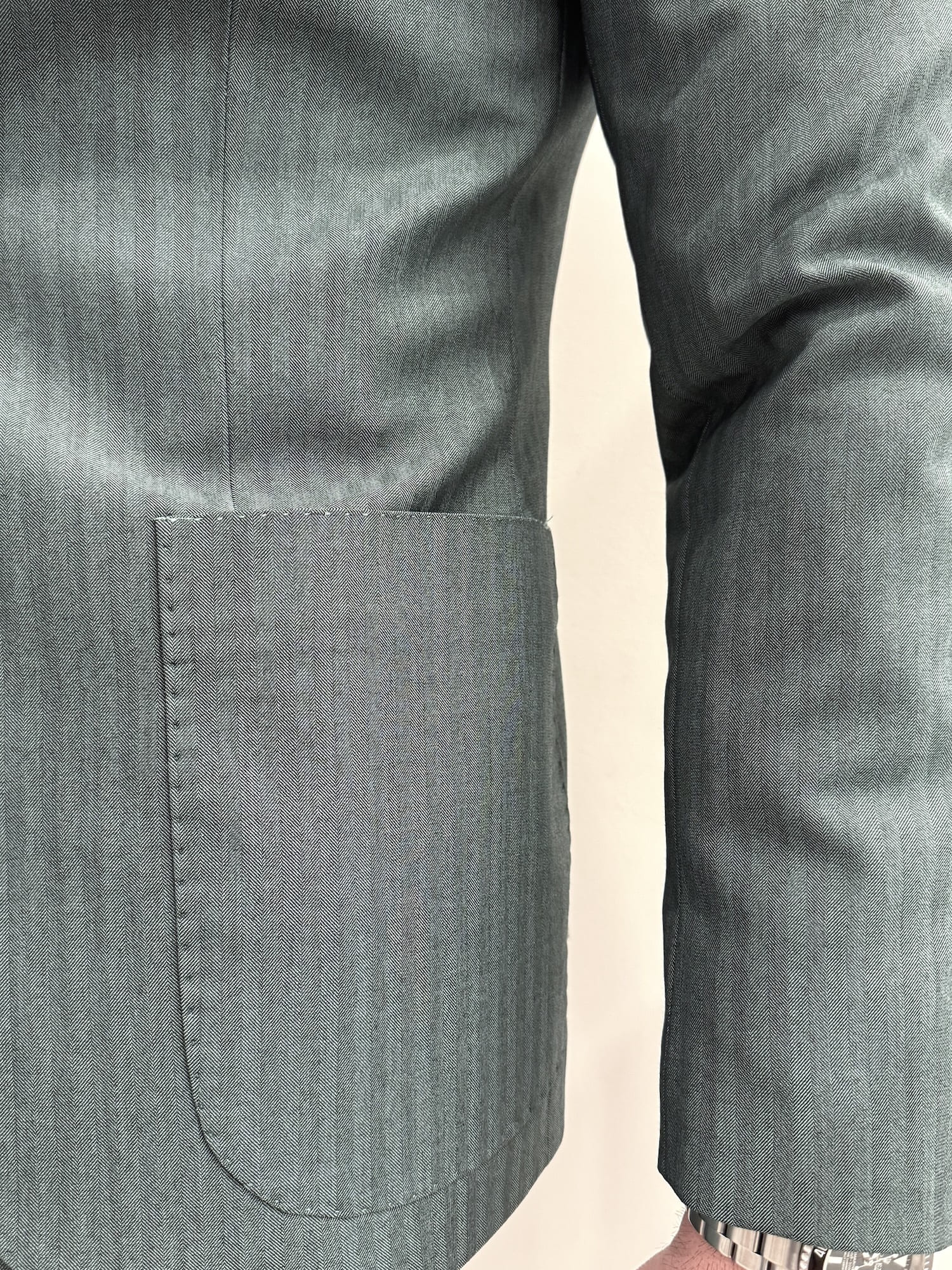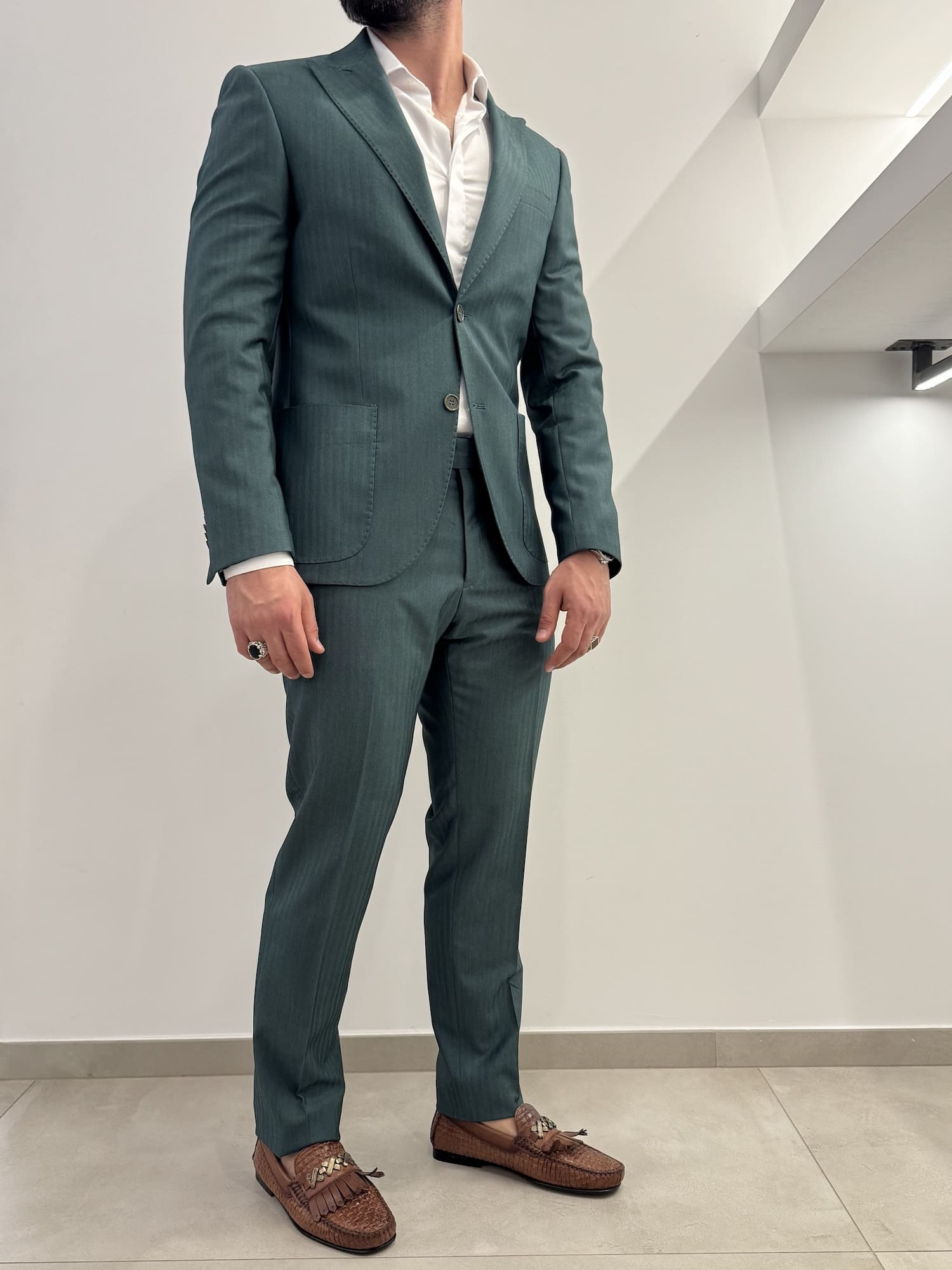 Abito slim uomo in tessuto Solaro ( poli-viscosa ) Giacca con tasche a toppa e pantalone con bottone decentrato.