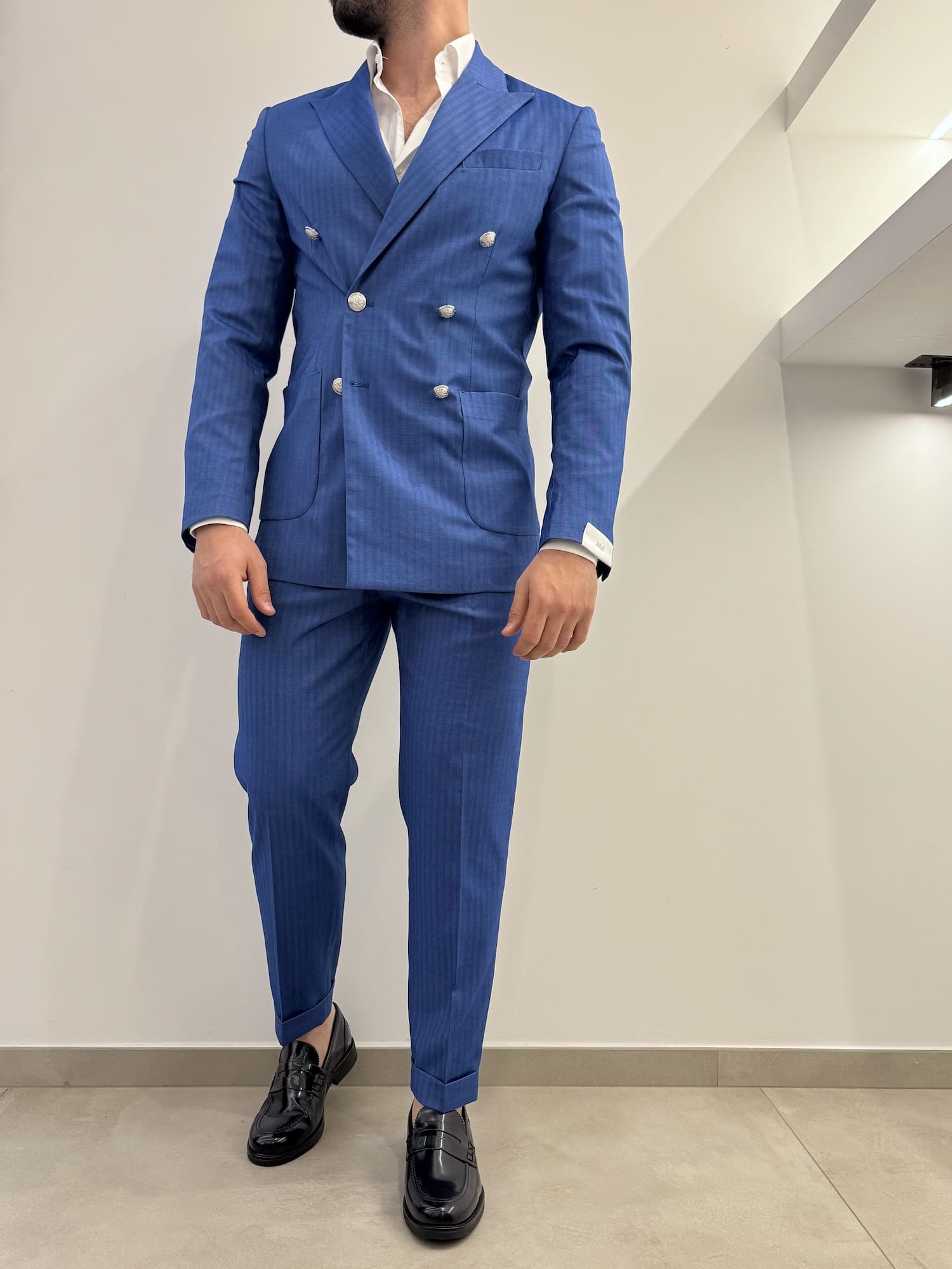 La giacca ha una vestibilità slim e il pantalone vestibilità ad imbuto ovvero un po' più ampio sulla parte superiore e più stretto sul fondo.