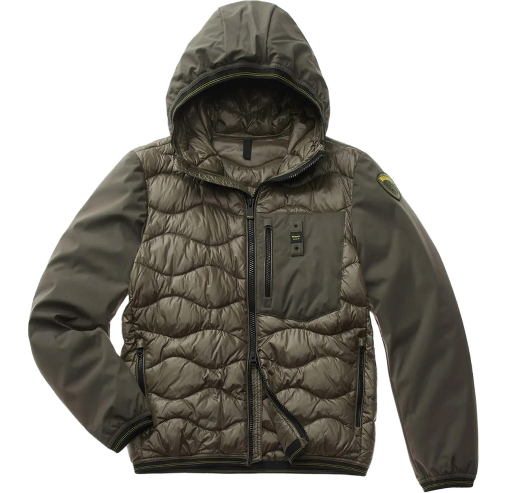 Piumino monocromatico idrorepellente con neoprene leggero e liscio in tono sulle maniche e corpo in nylon lucido impunturato ad onde.
