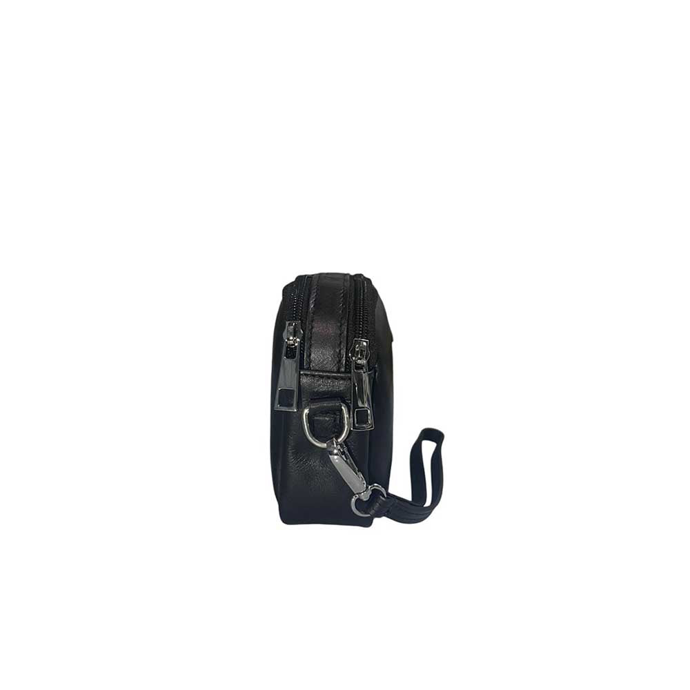 Borsetta uomo Bogesi in pelle nera, pratica e compatta con doppia chiusura a zip e cinturino da polso removibile.
