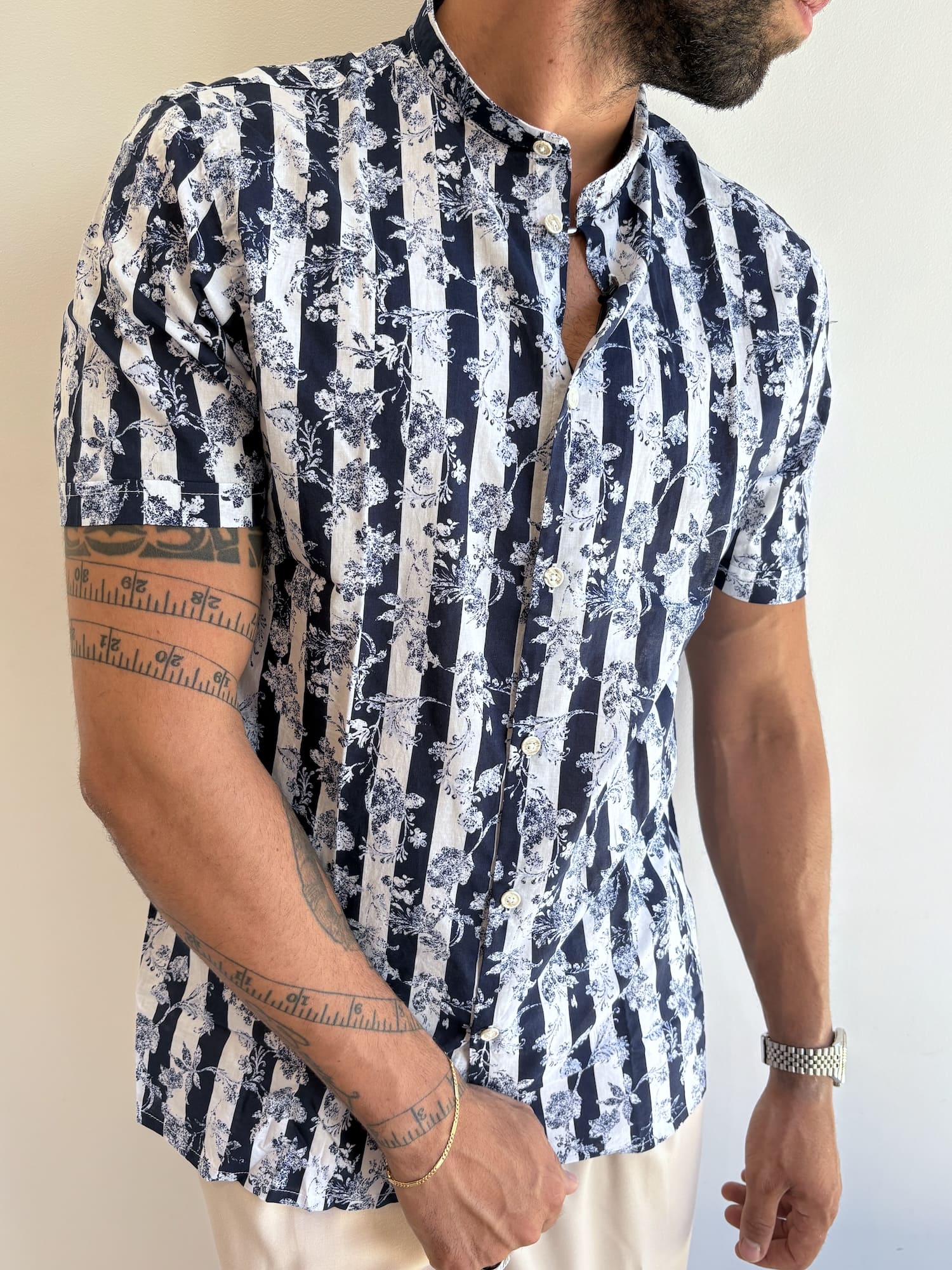 Camicia maniche corte a righe e fantasia floreale con collo alla coreana