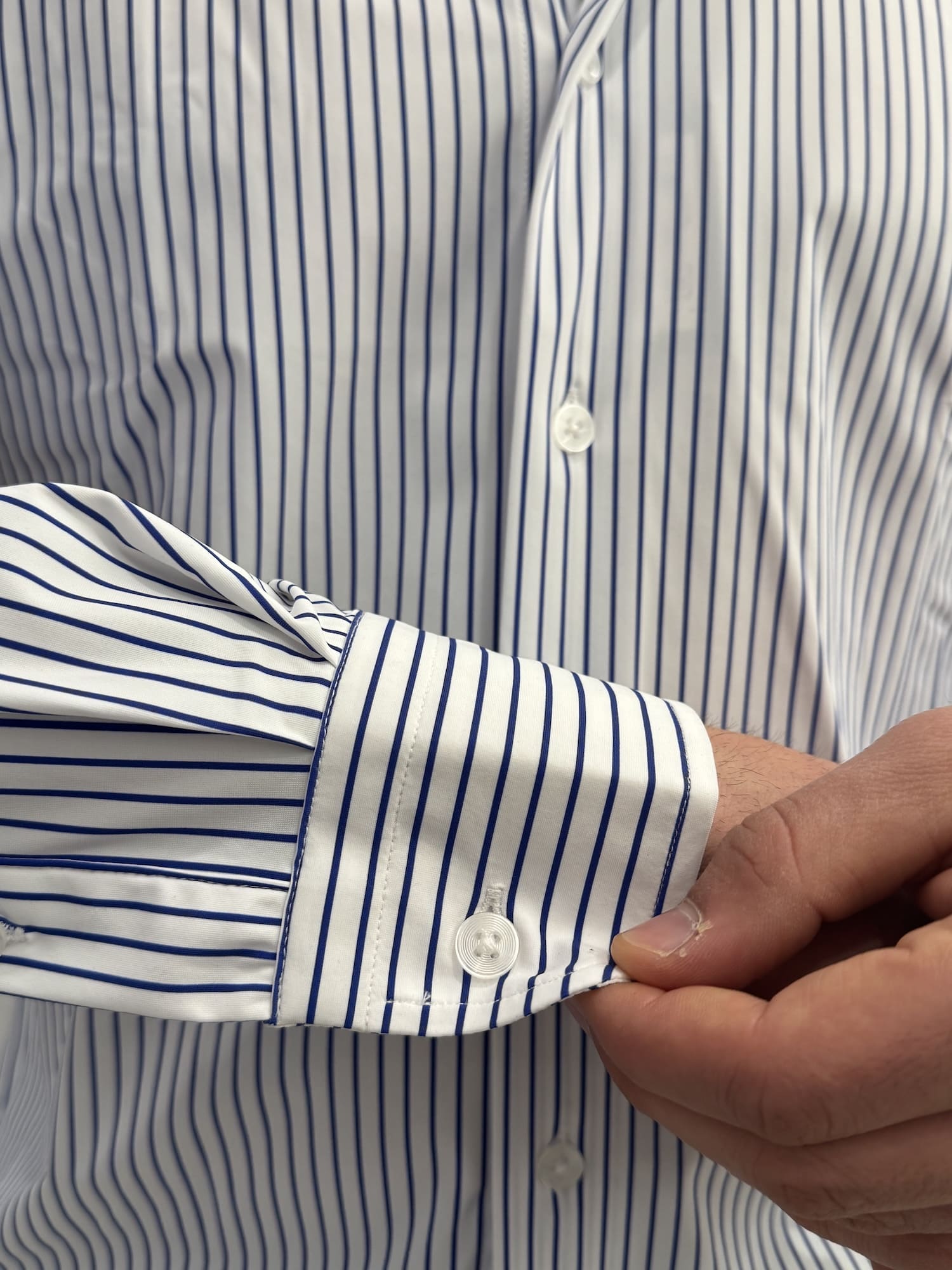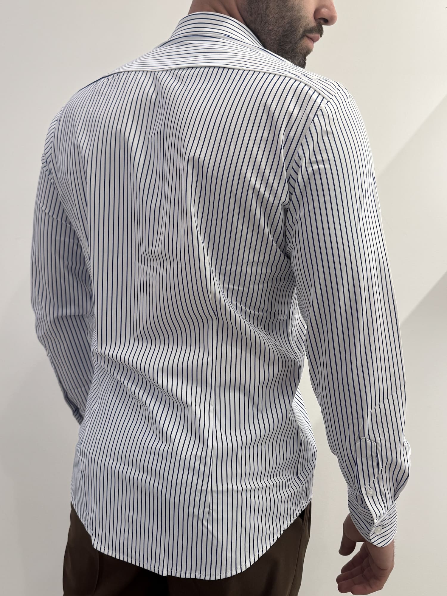 Camicia tessuto performance con fantasia a riga stretta con collo francese.