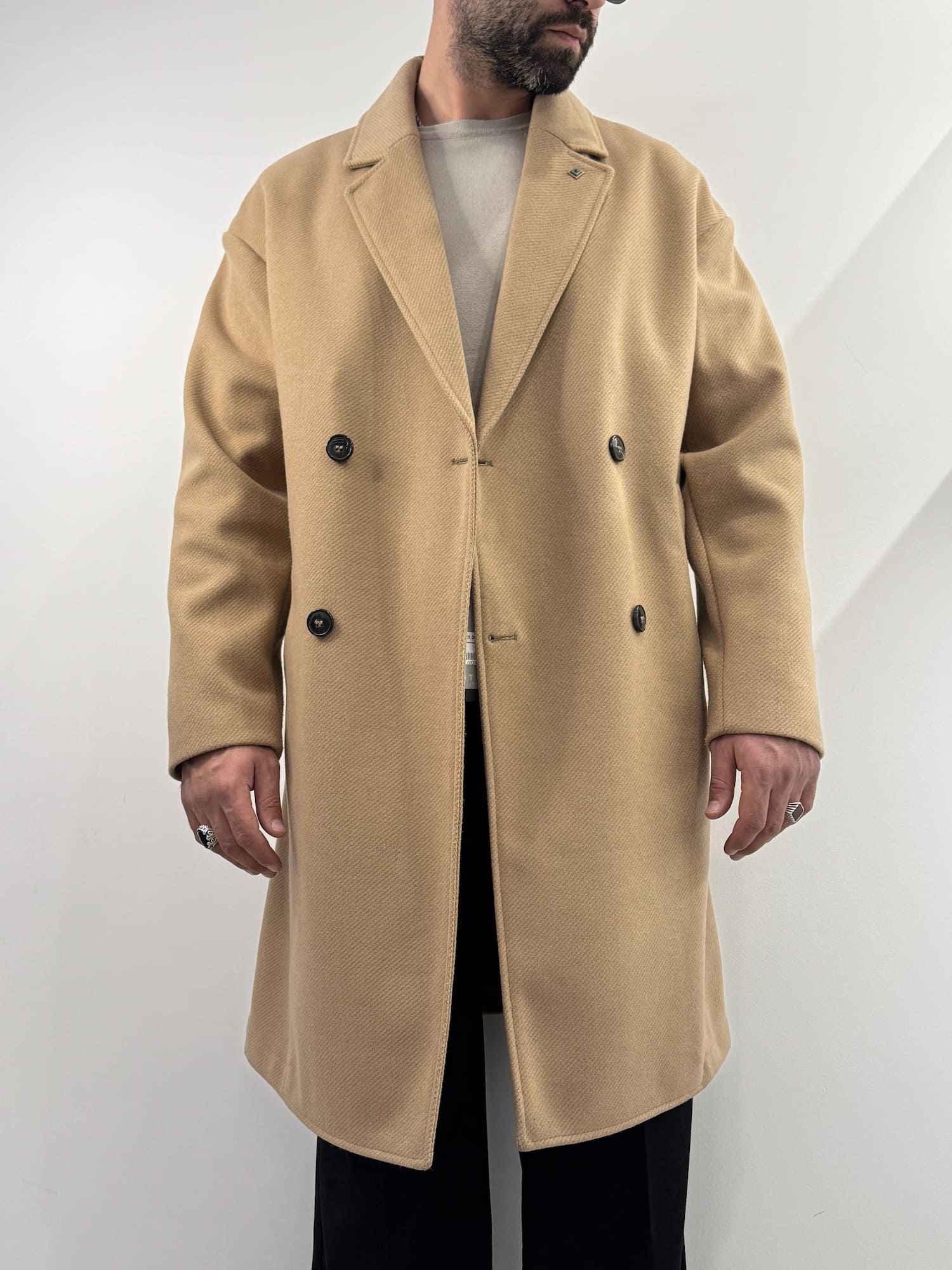 Cappotto over doppio petto beige Out/ Fit