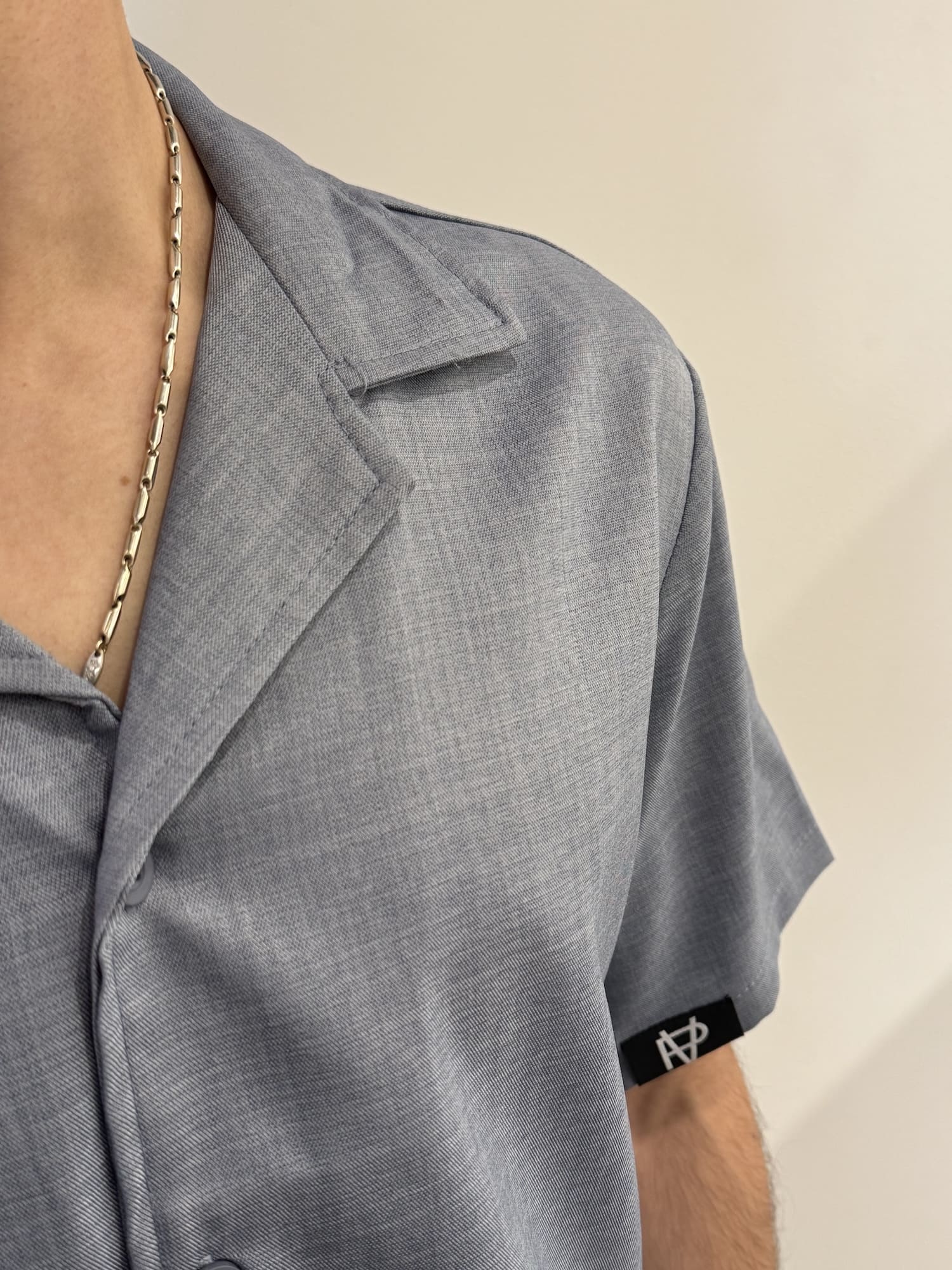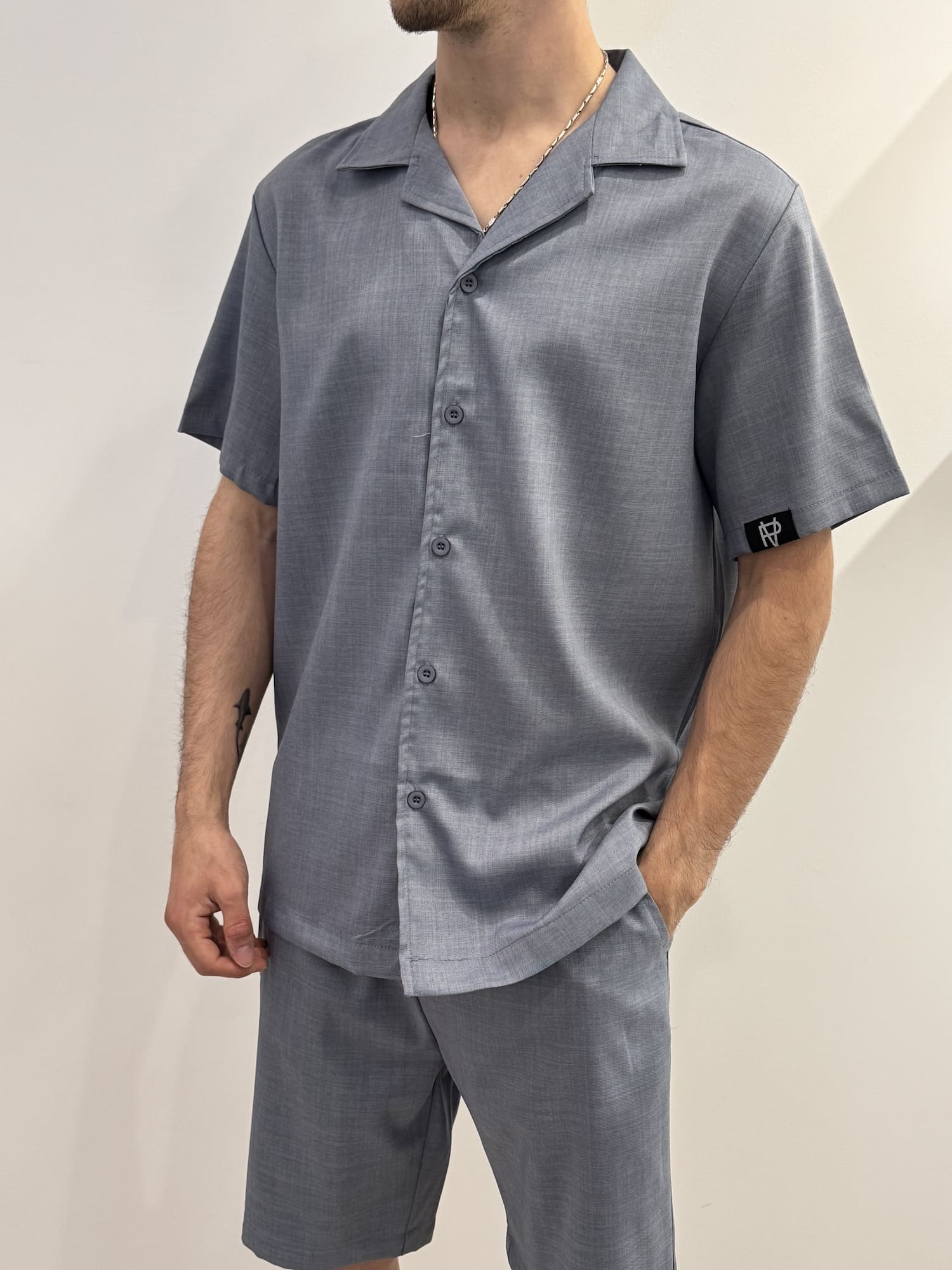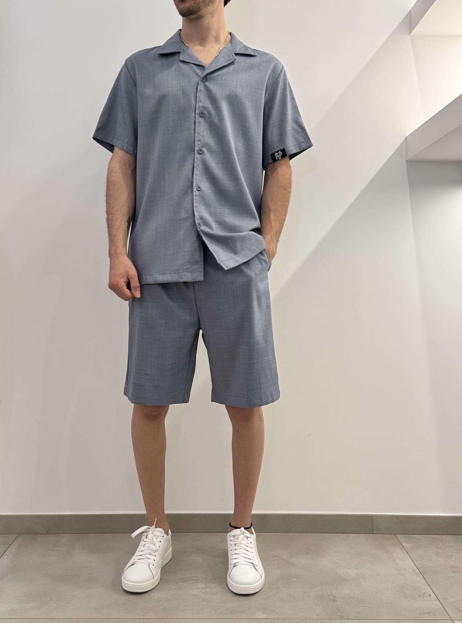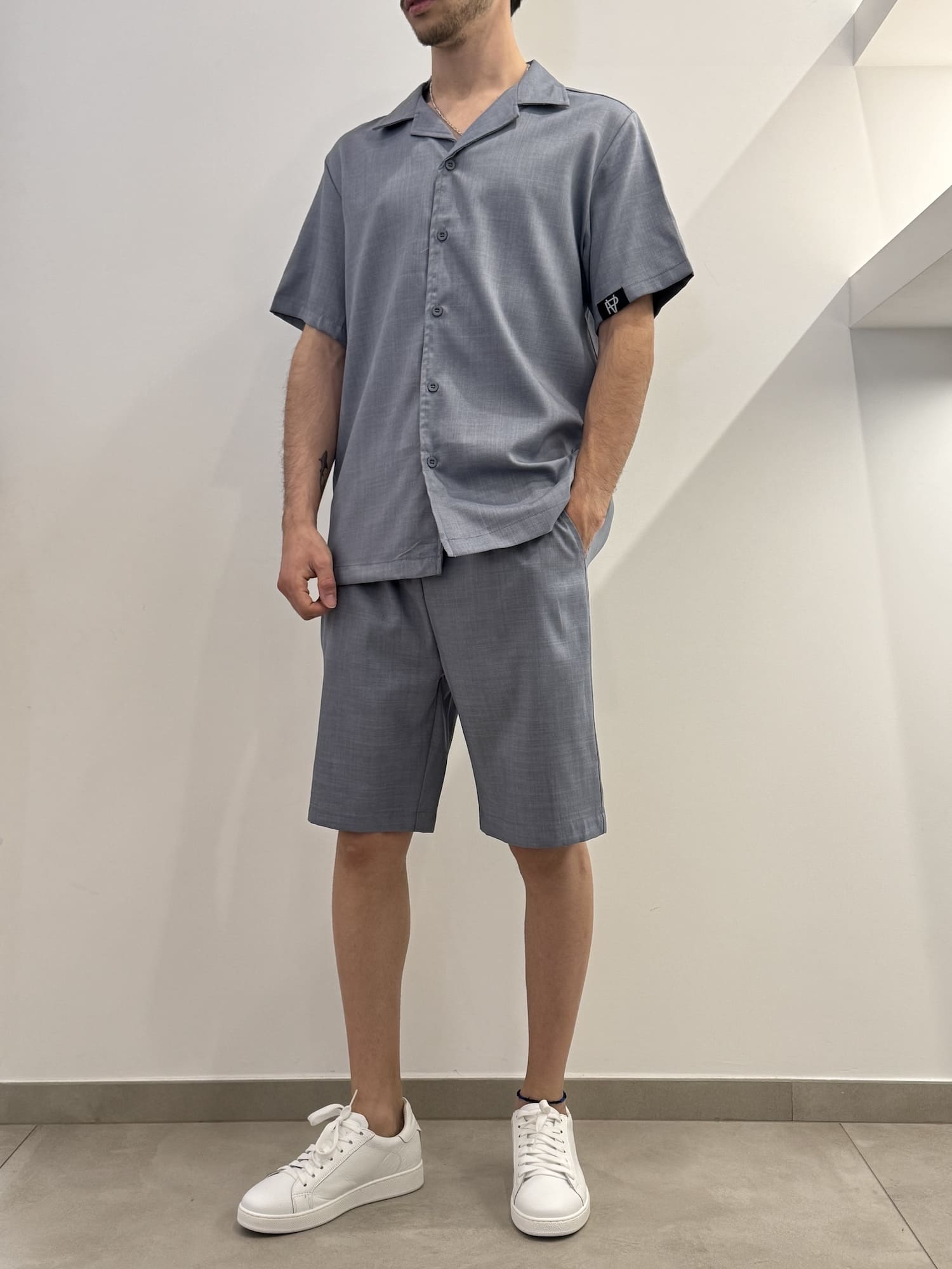 Coordinato in poliviscosa con camicia hawaiana e pantaloncino con elastico e molla in vita.