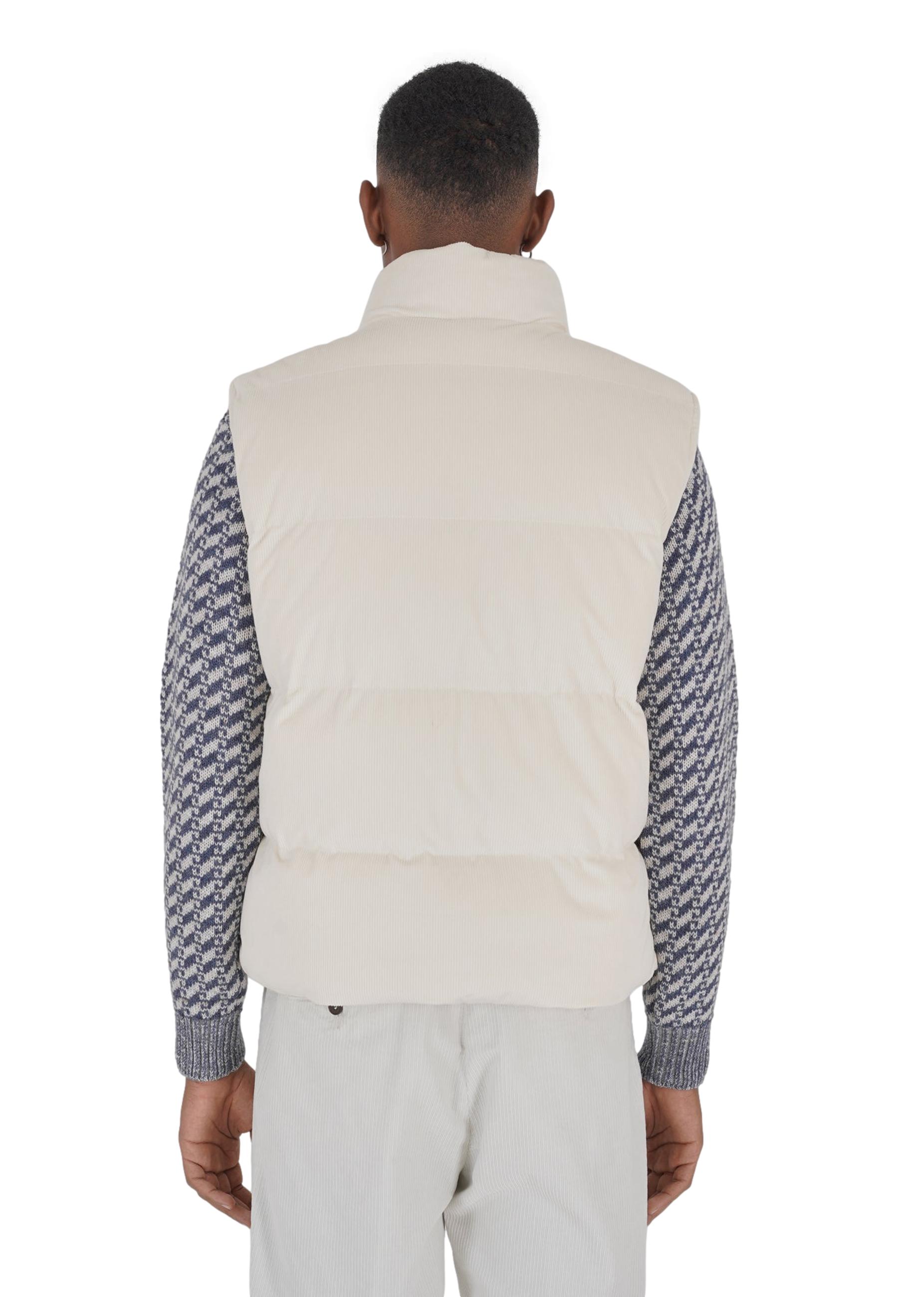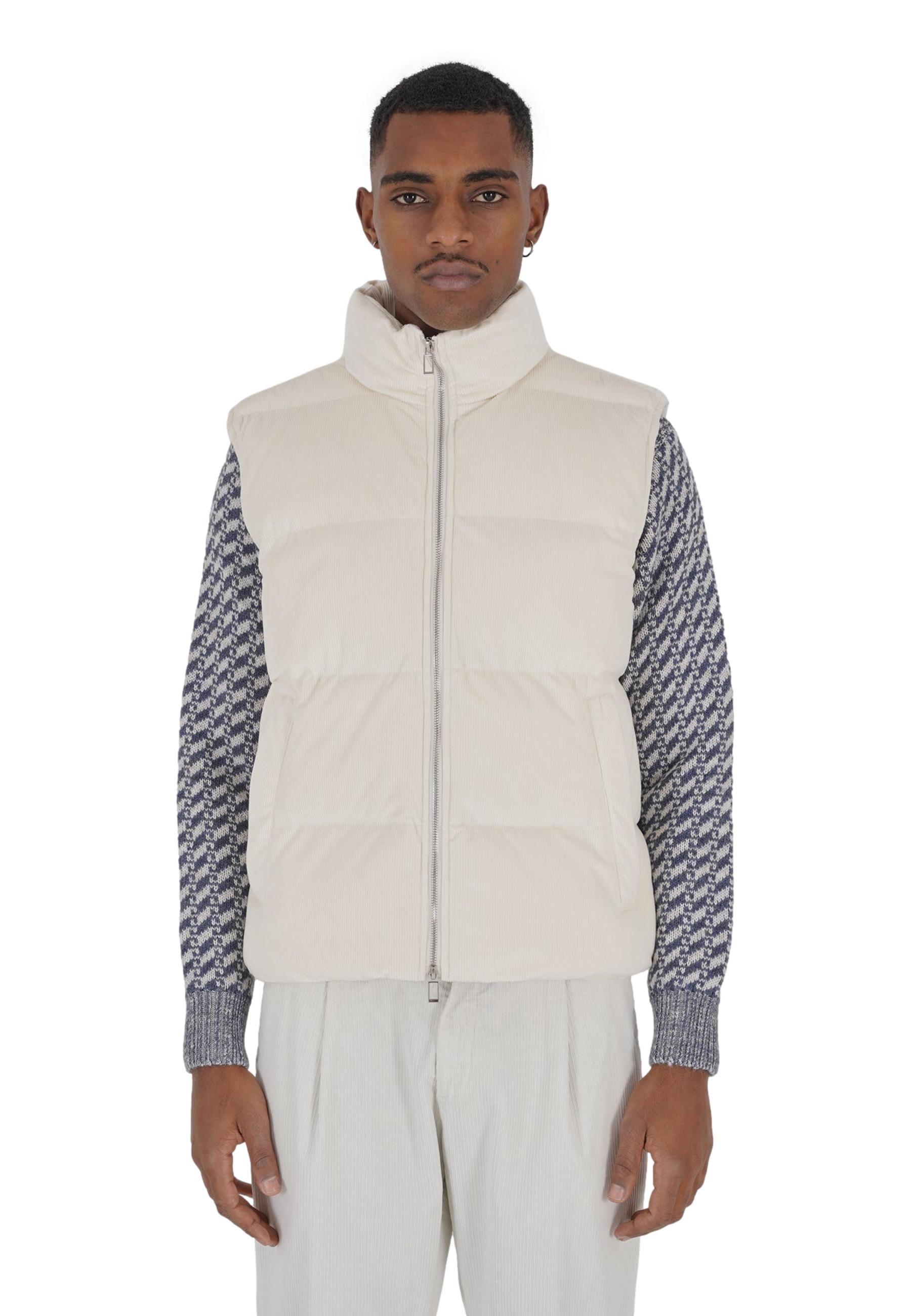 Giubbotto Smanicato Outfit Jkt Sleeveless da uomo trapuntato in velluto a coste di poliestere, con imbottitura sintetica, collo alto, chiusura centrale full zip a doppio cursore, tasche laterali a filo con zip coperte e fondo regolabile da stopper interni