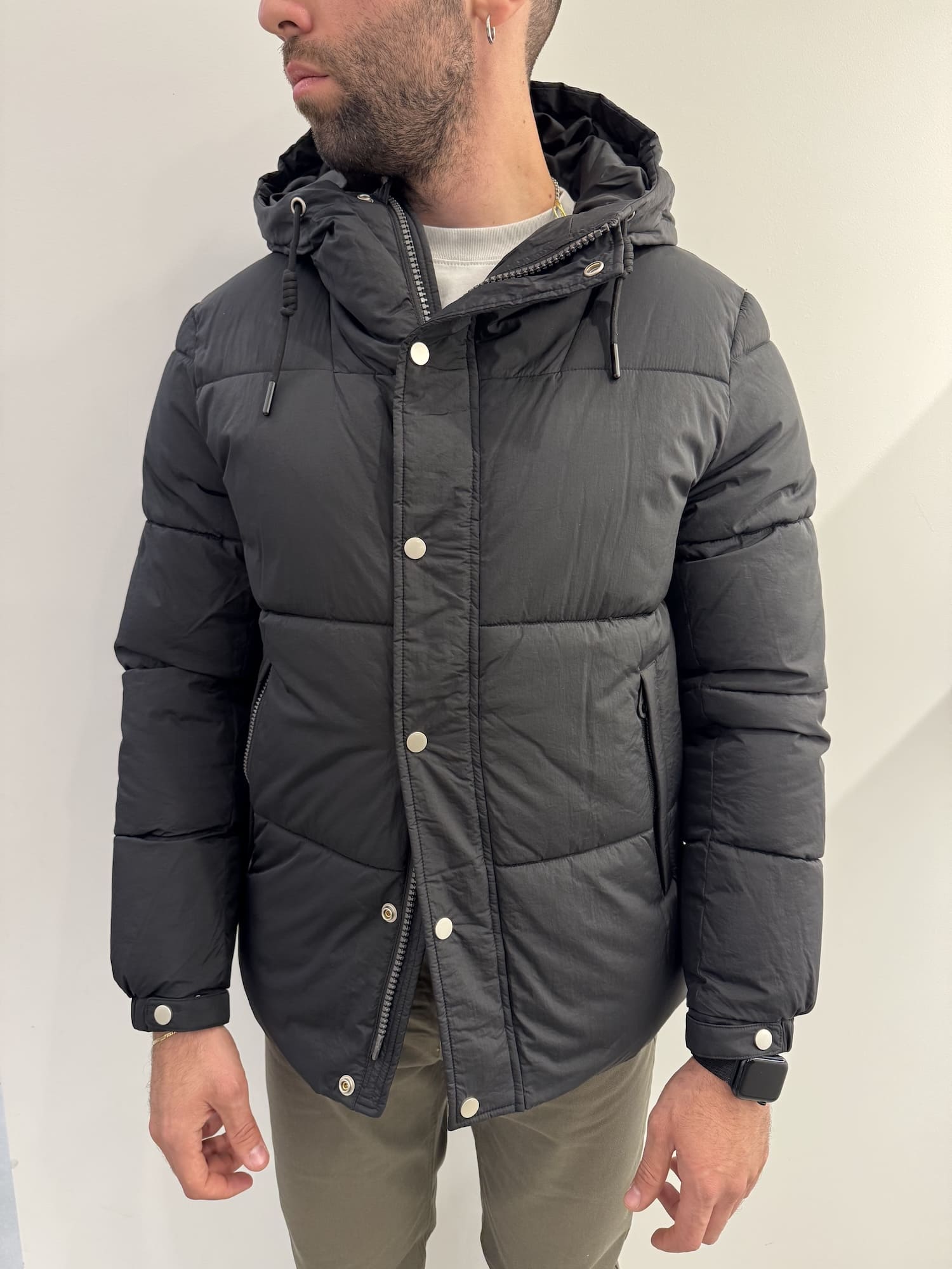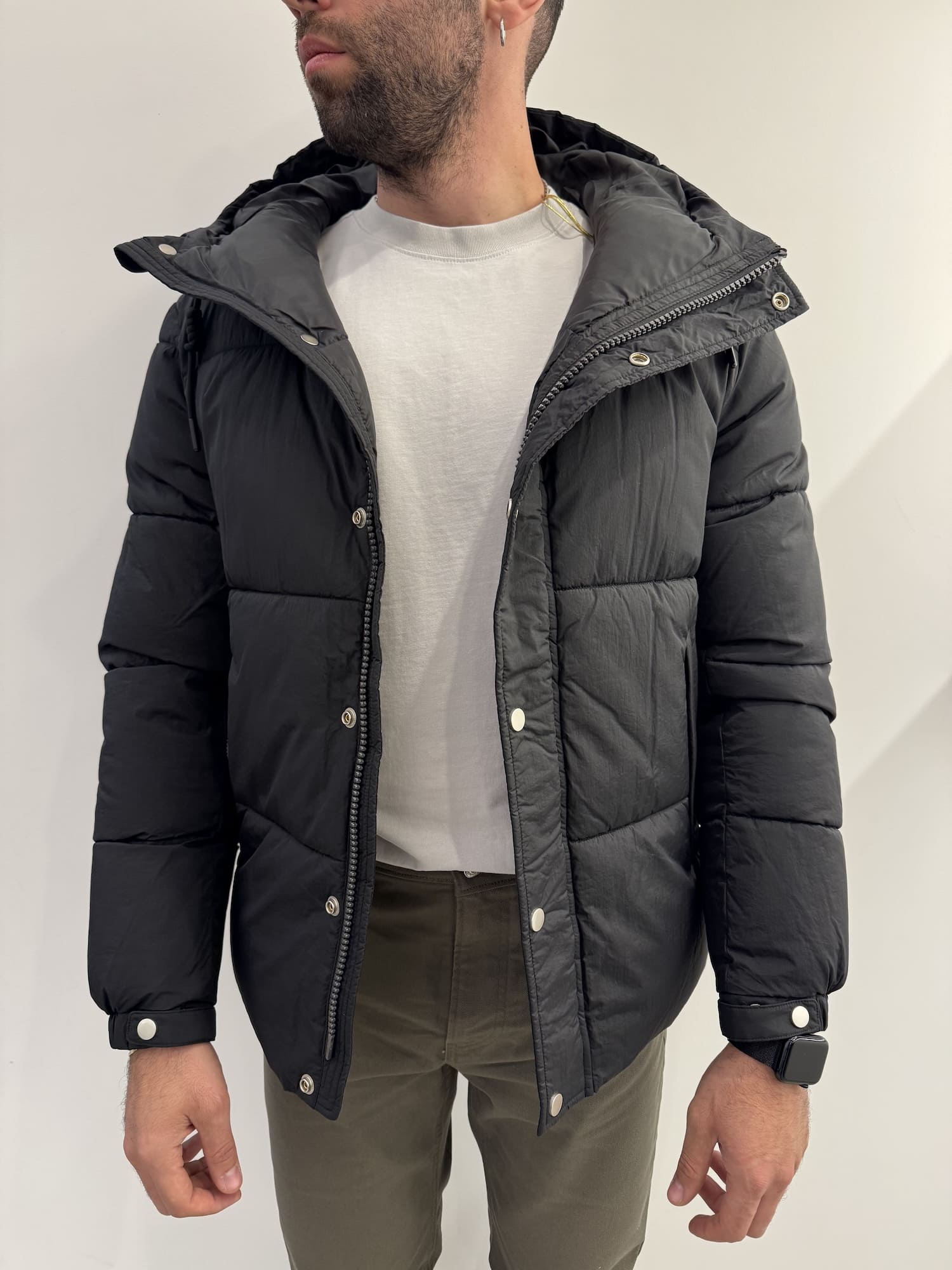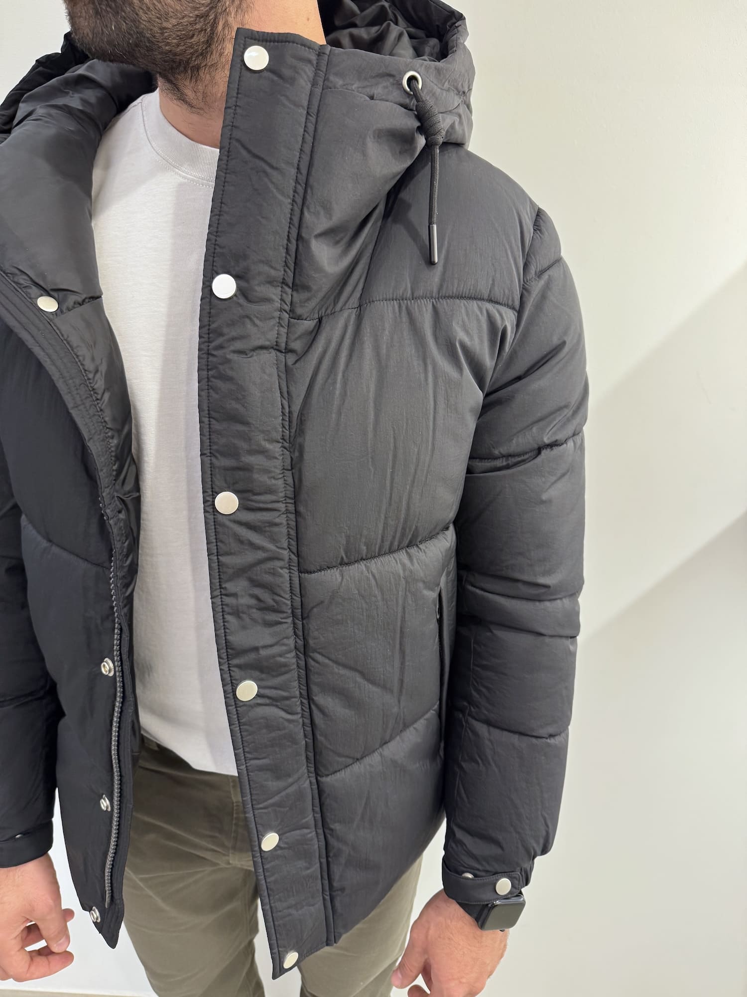 Giubbotto trapunta larga con bottoni e cerniera con cordoncino regolabile.