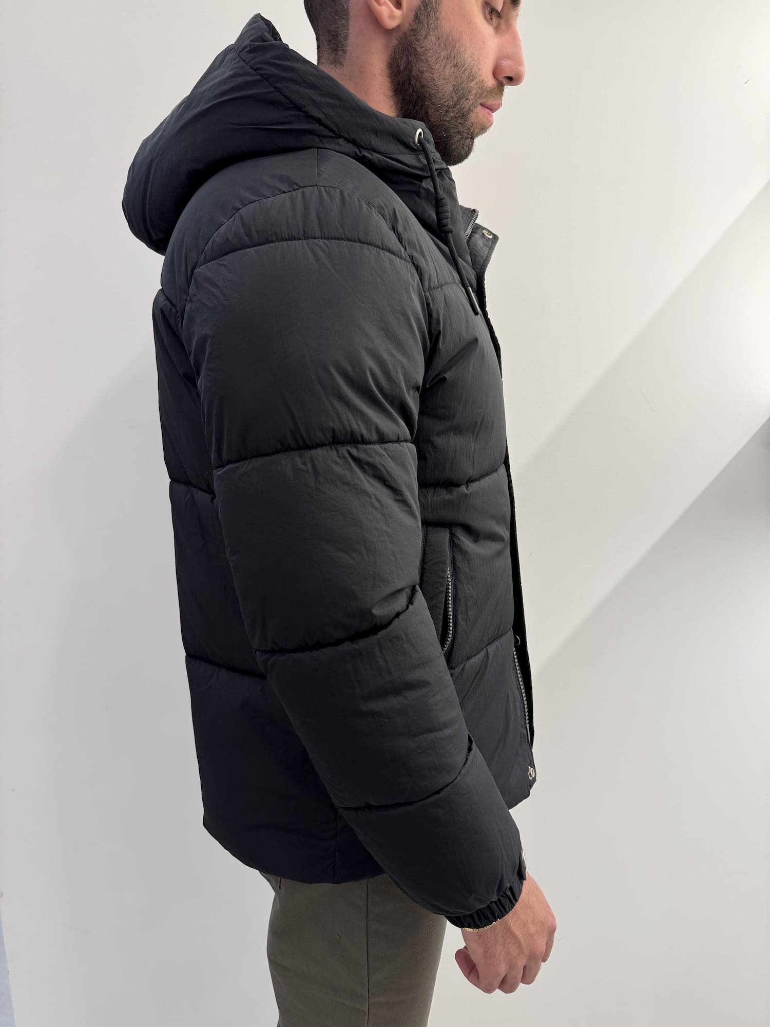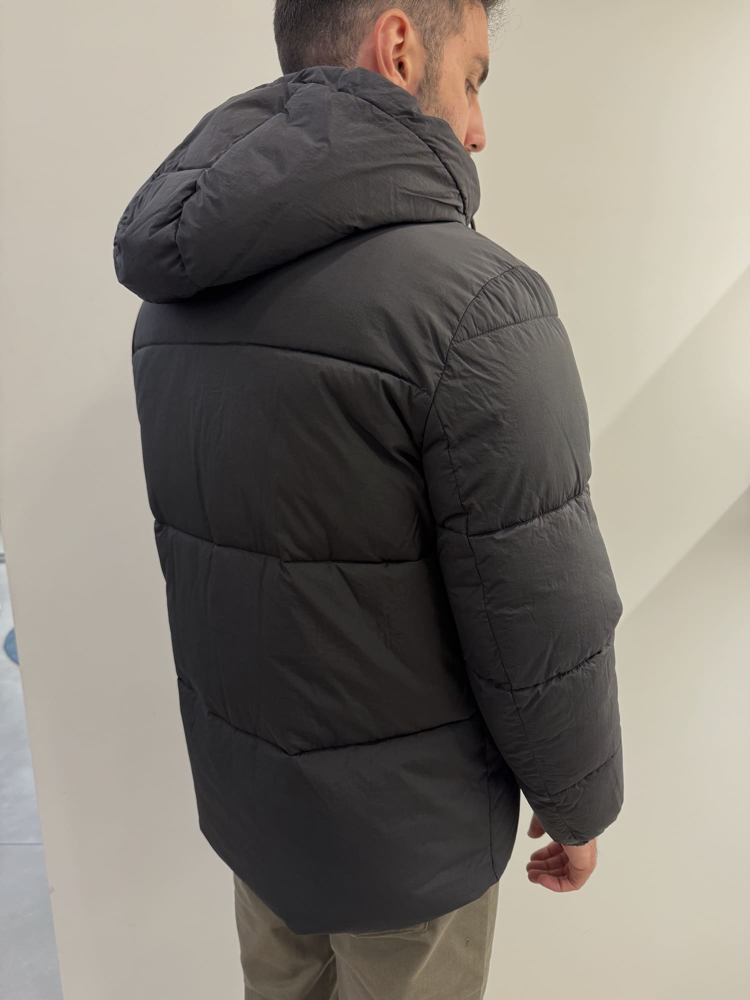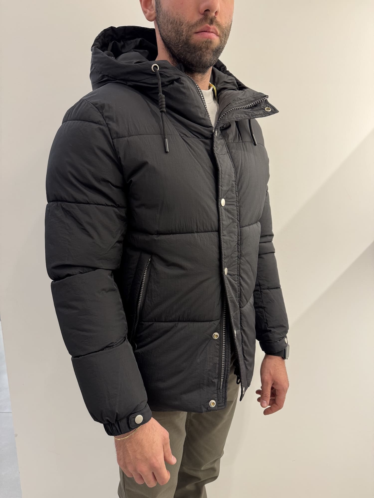 Giubbotto trapunta larga con bottoni e cerniera con cordoncino regolabile.