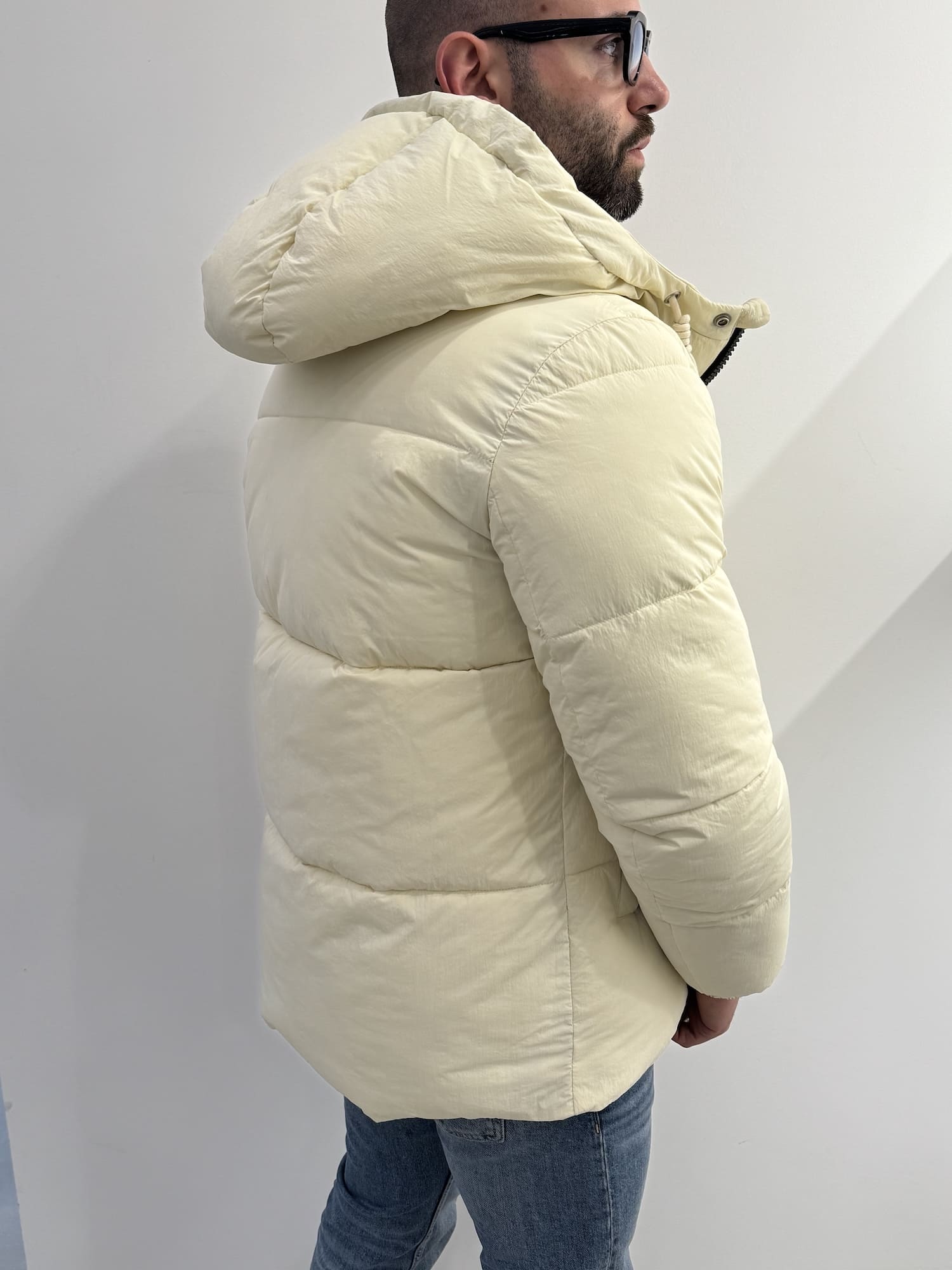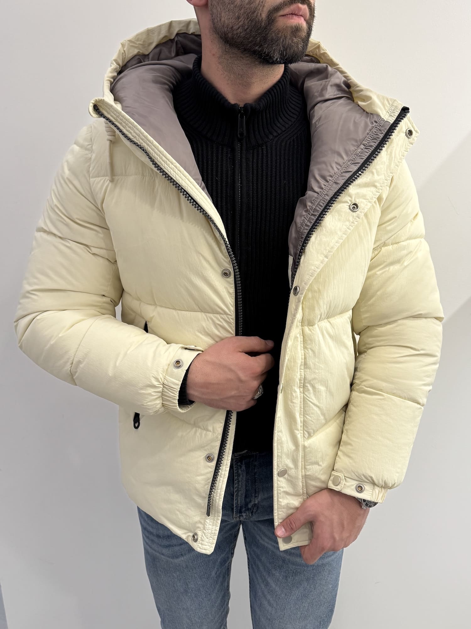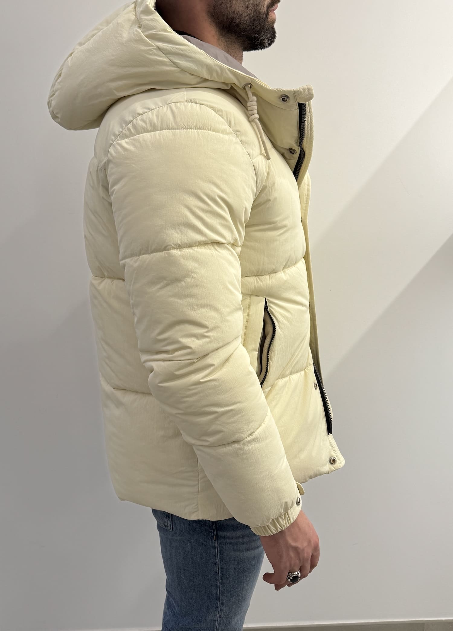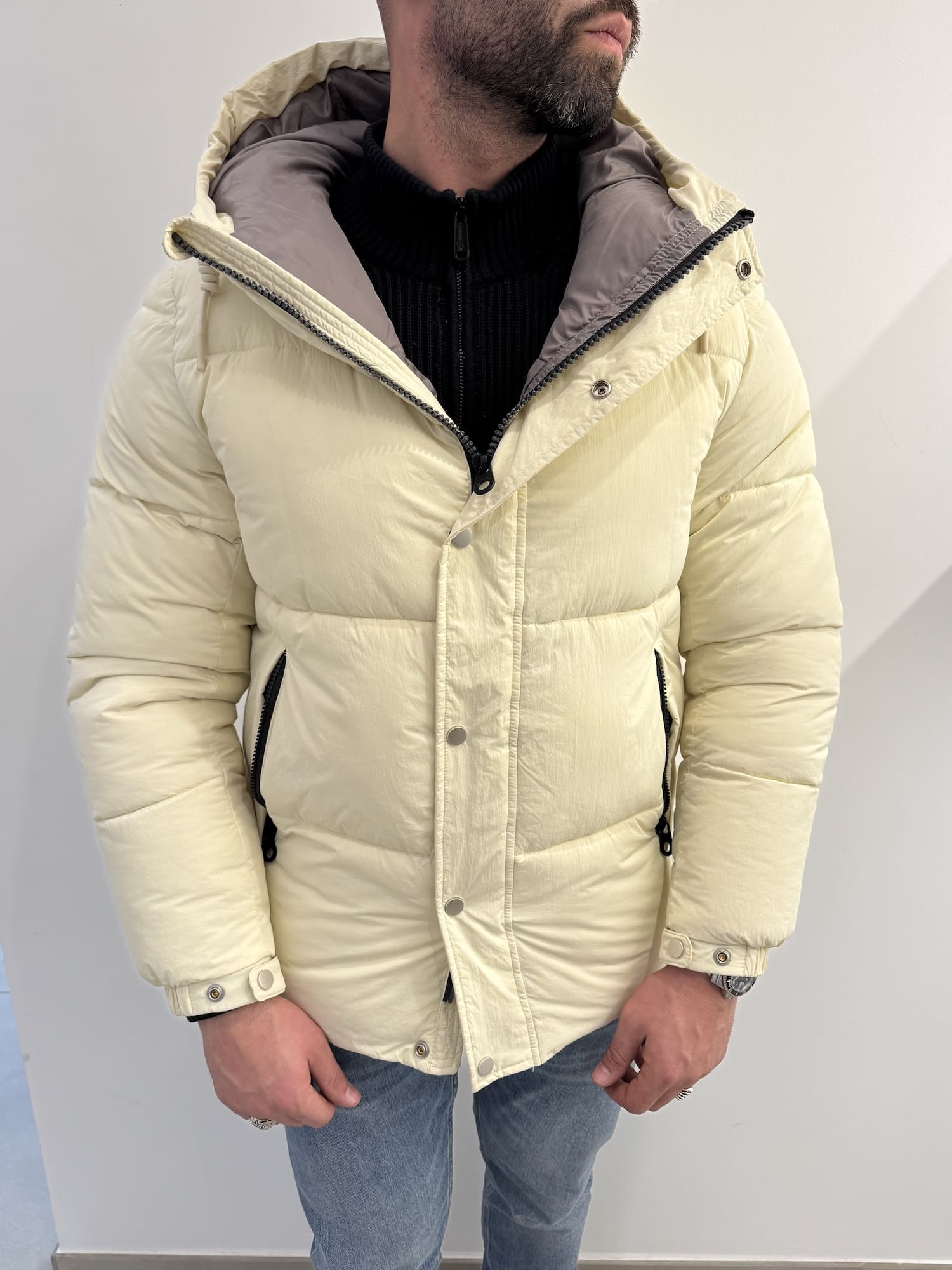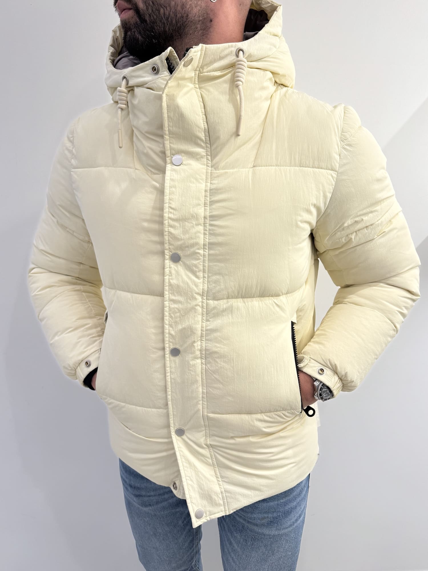 Giubbotto trapunta larga con bottoni e cerniera con cordoncino regolabile.