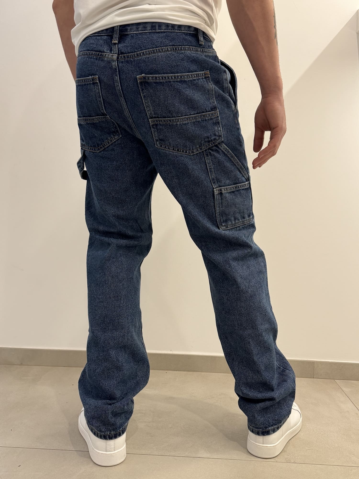 Jeans carpenter scuro in tela fissa con porta martello.