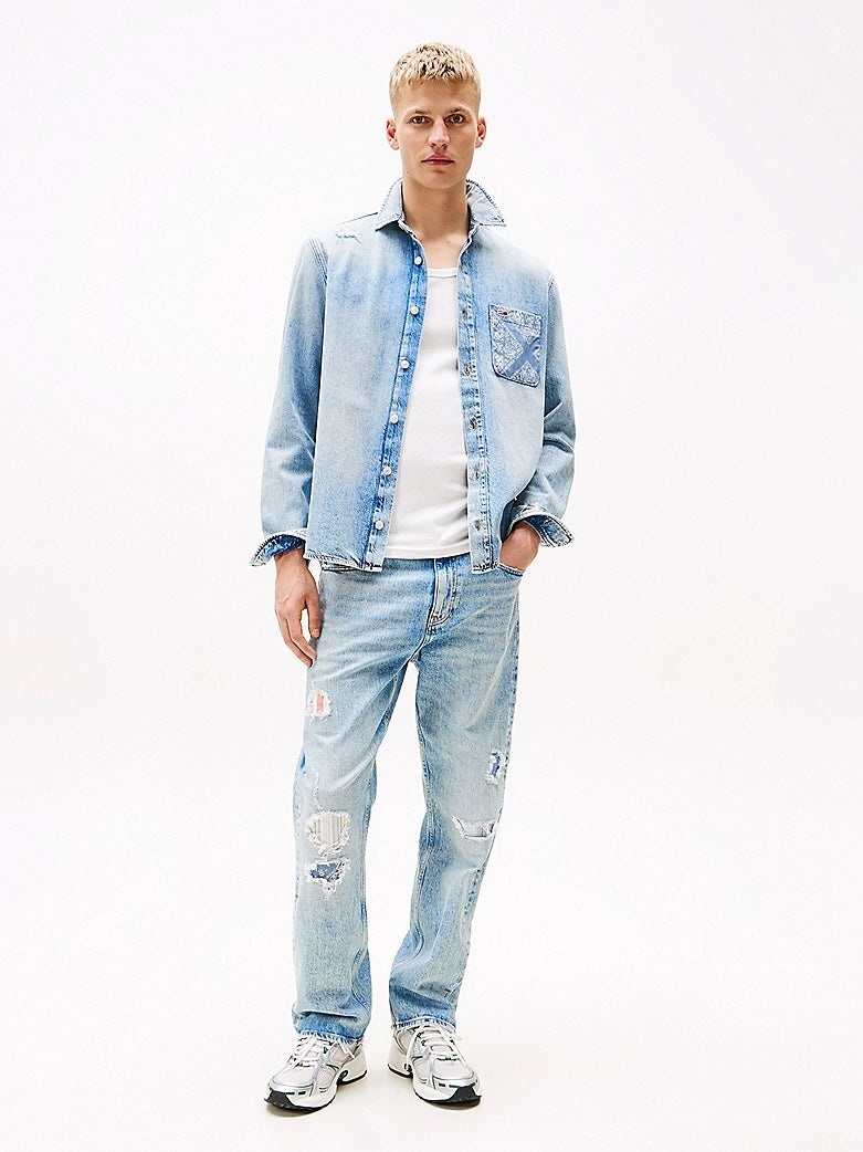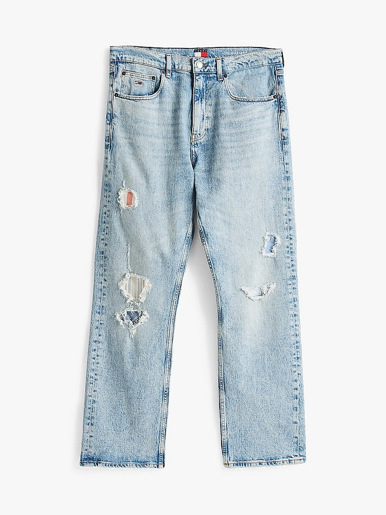 I jeans dal taglio dritto sono caratterizzati dai dettagli effetto vissuto e dal motivo patchwork sulla tasca posteriore che aggiunge un tocco unico.