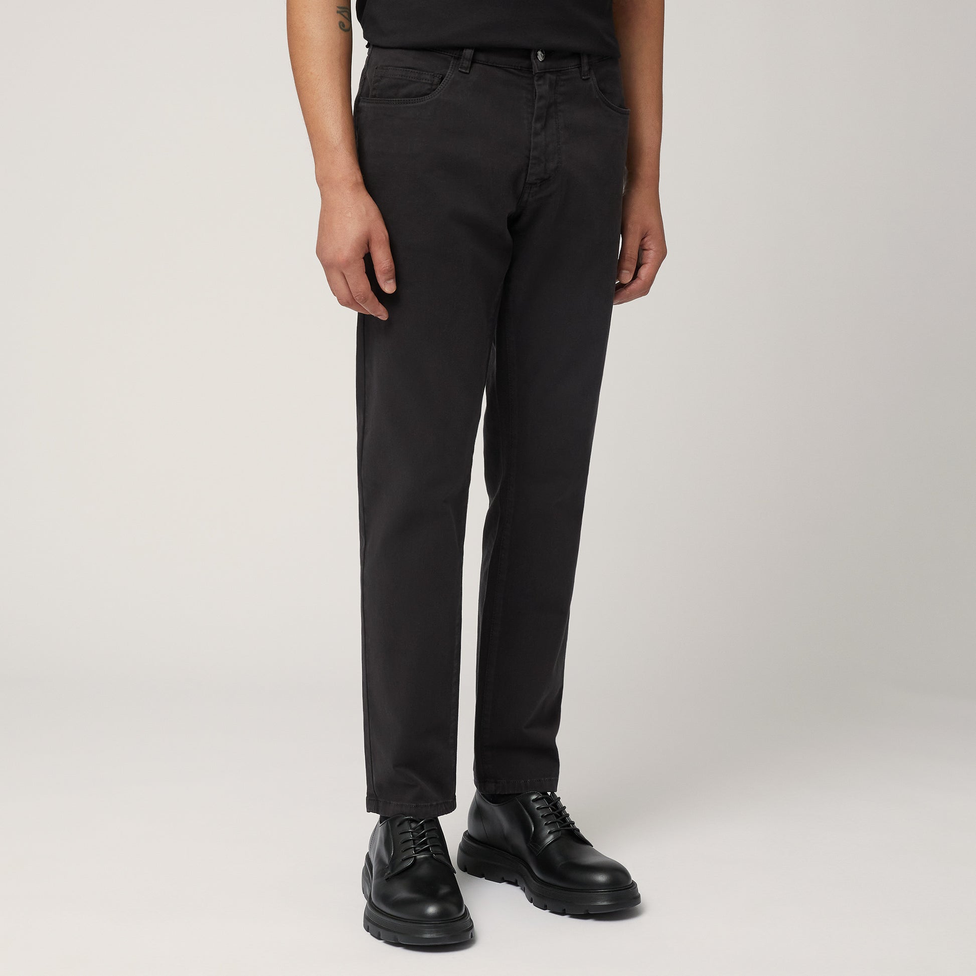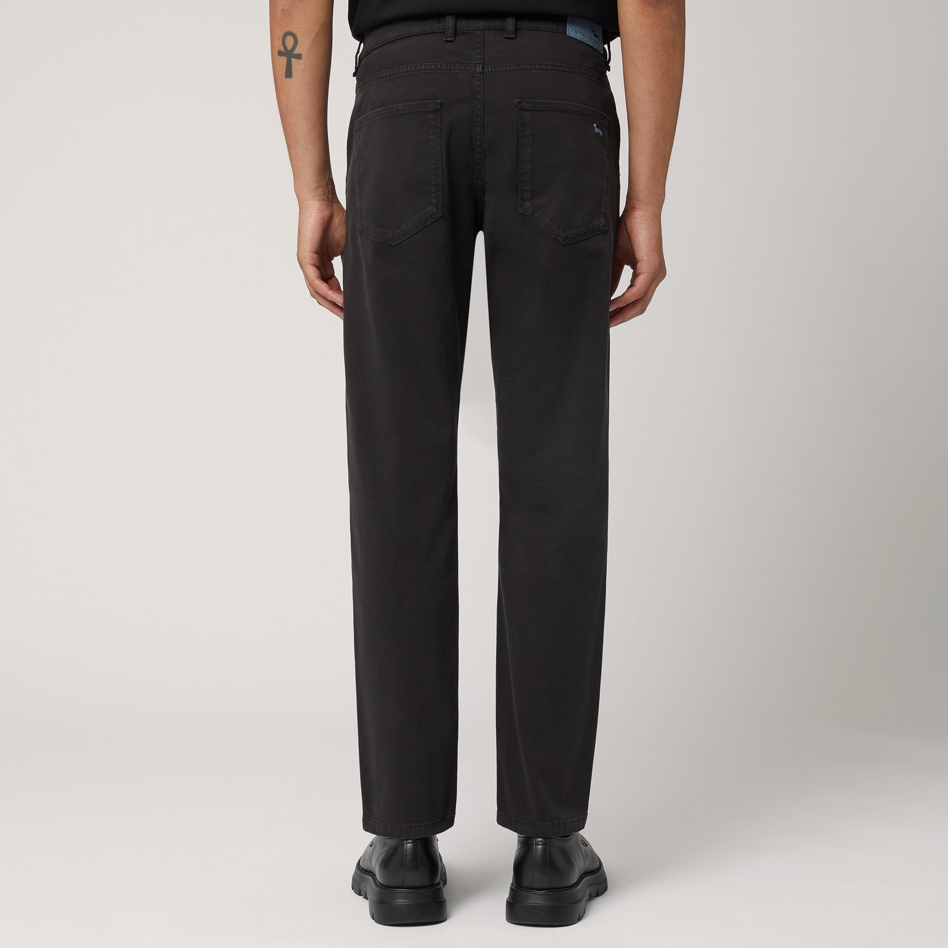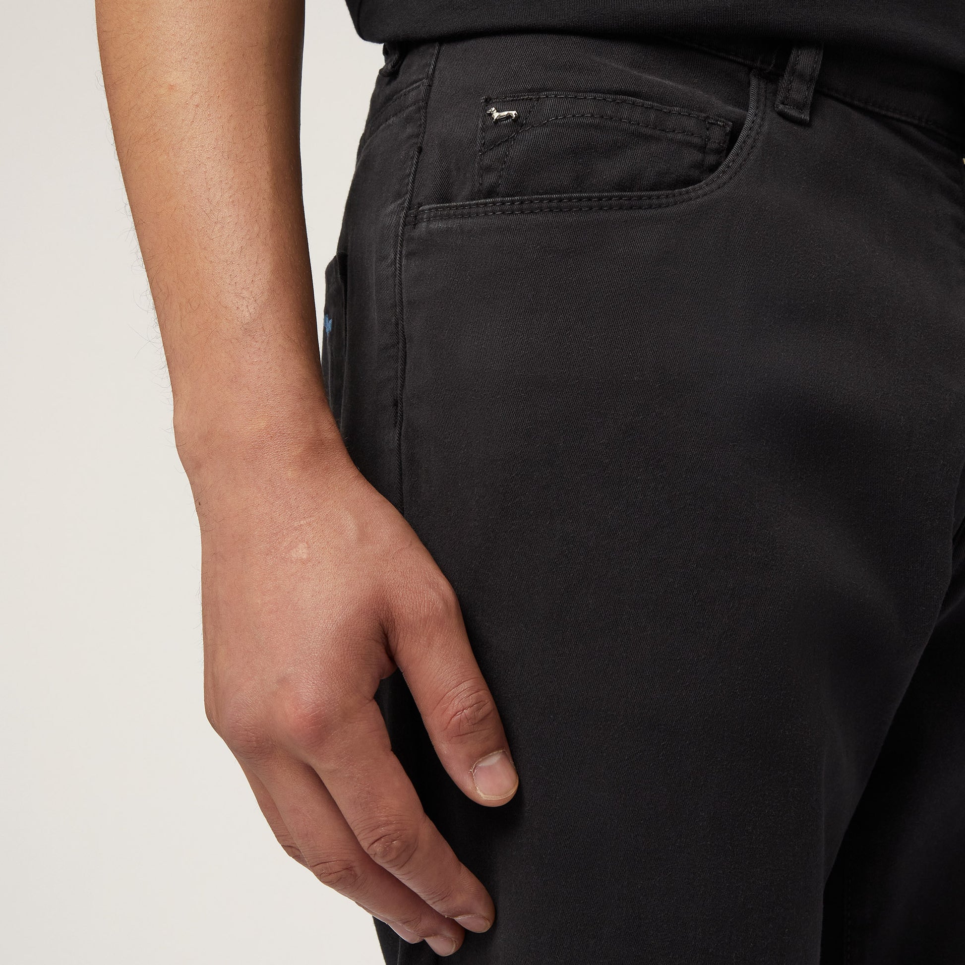 Ideali per chi predilige una vestibilità slim, i pantaloni da uomo realizzati in cotone stretch presentano un design a cinque tasche molto versatile. Rivetto bassotto sul quinto taschino e il ricamo del bassotto su una delle due tasche posteriori applicate. La pratica chiusura con bottone e zip nascosta conferisce invece maggiore funzionalità al capo.