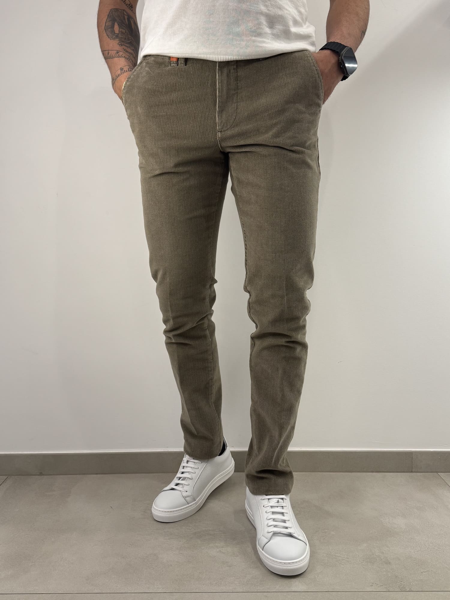 Modello tasca a filo con tasche posteriori con chiusura con bottone.