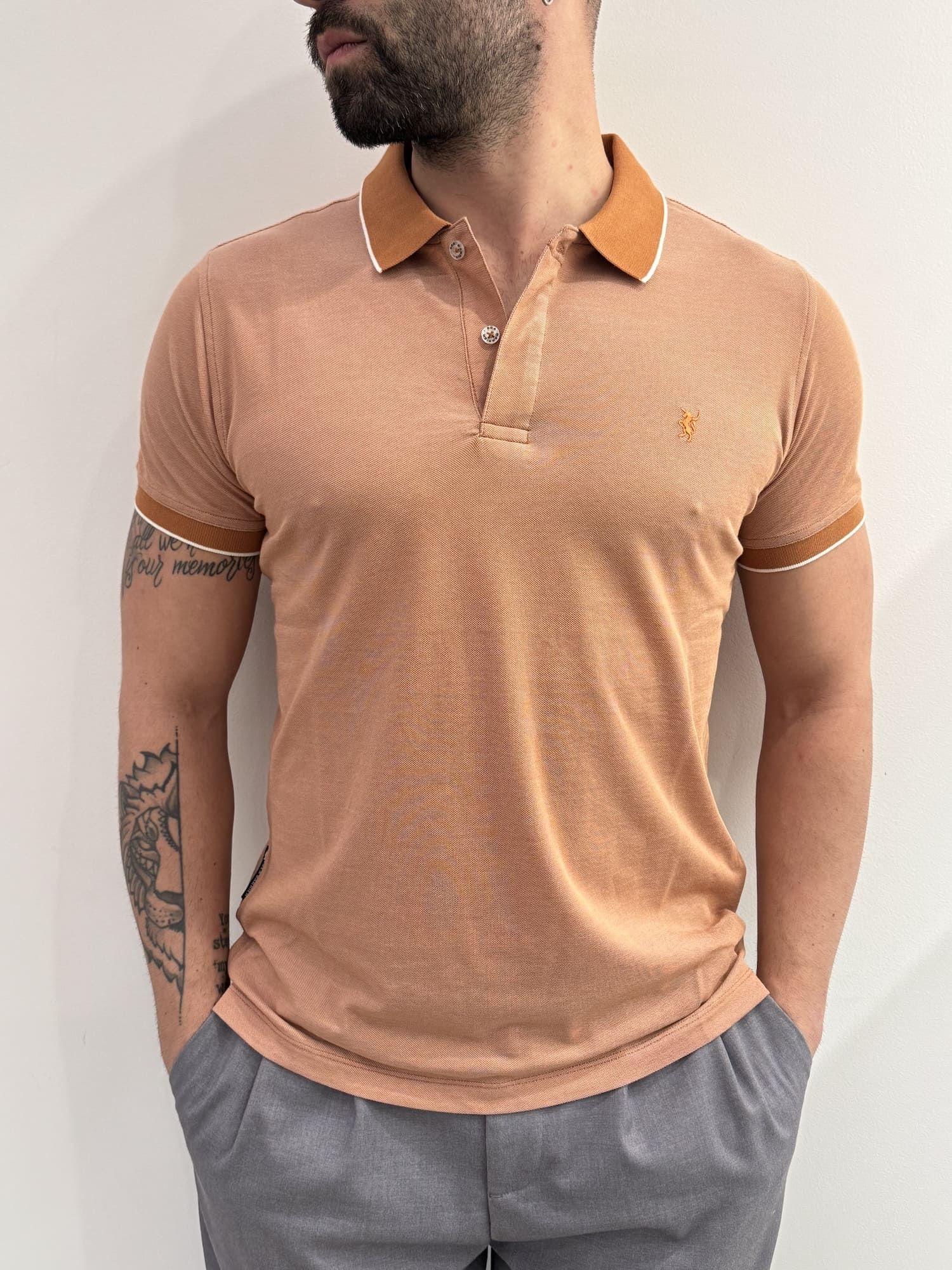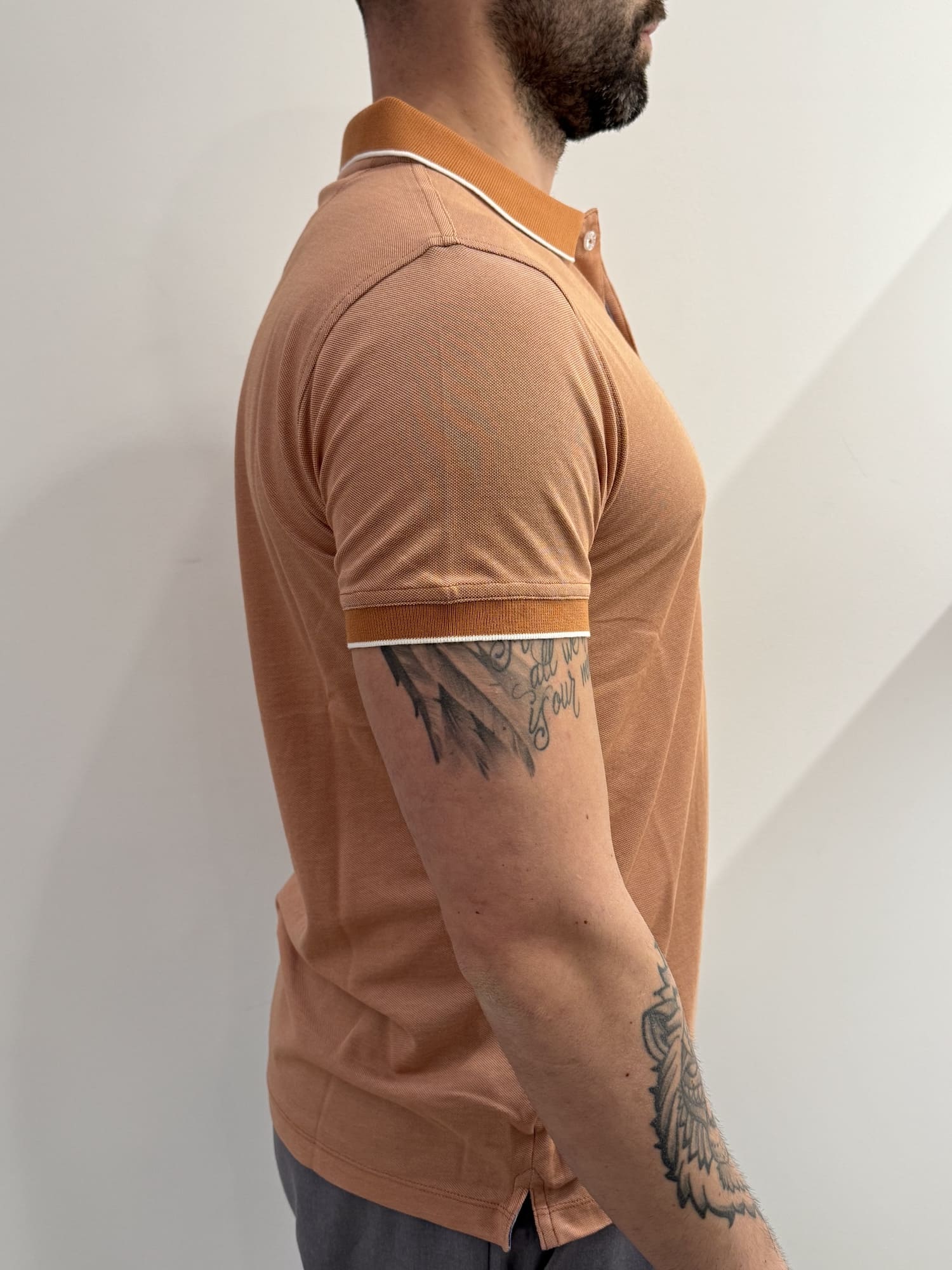 Polo maniche corte in cotone piquet elasticizzato NO IRON, quindi facile da stirare, con micro fantasia