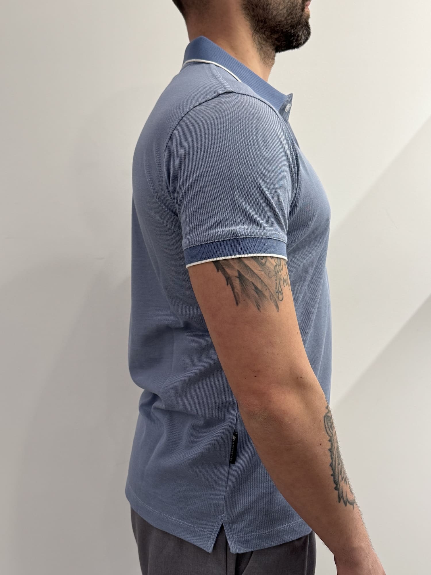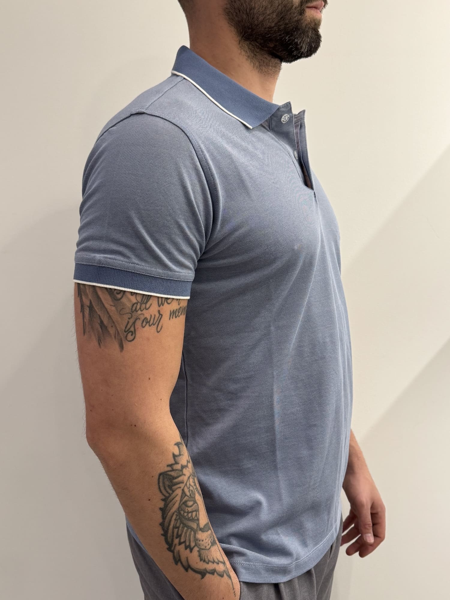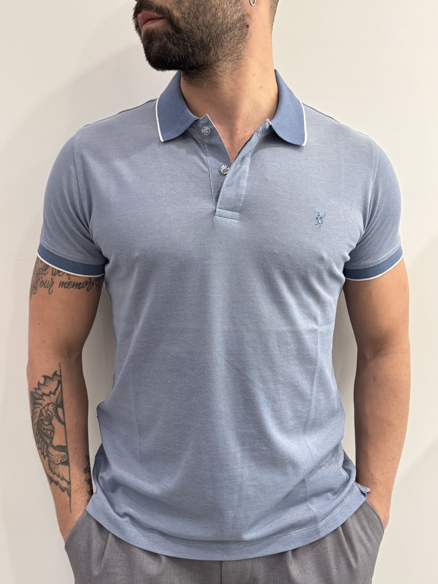 Polo maniche corte in cotone piquet elasticizzato NO IRON, quindi facile da stirare, con micro fantasia