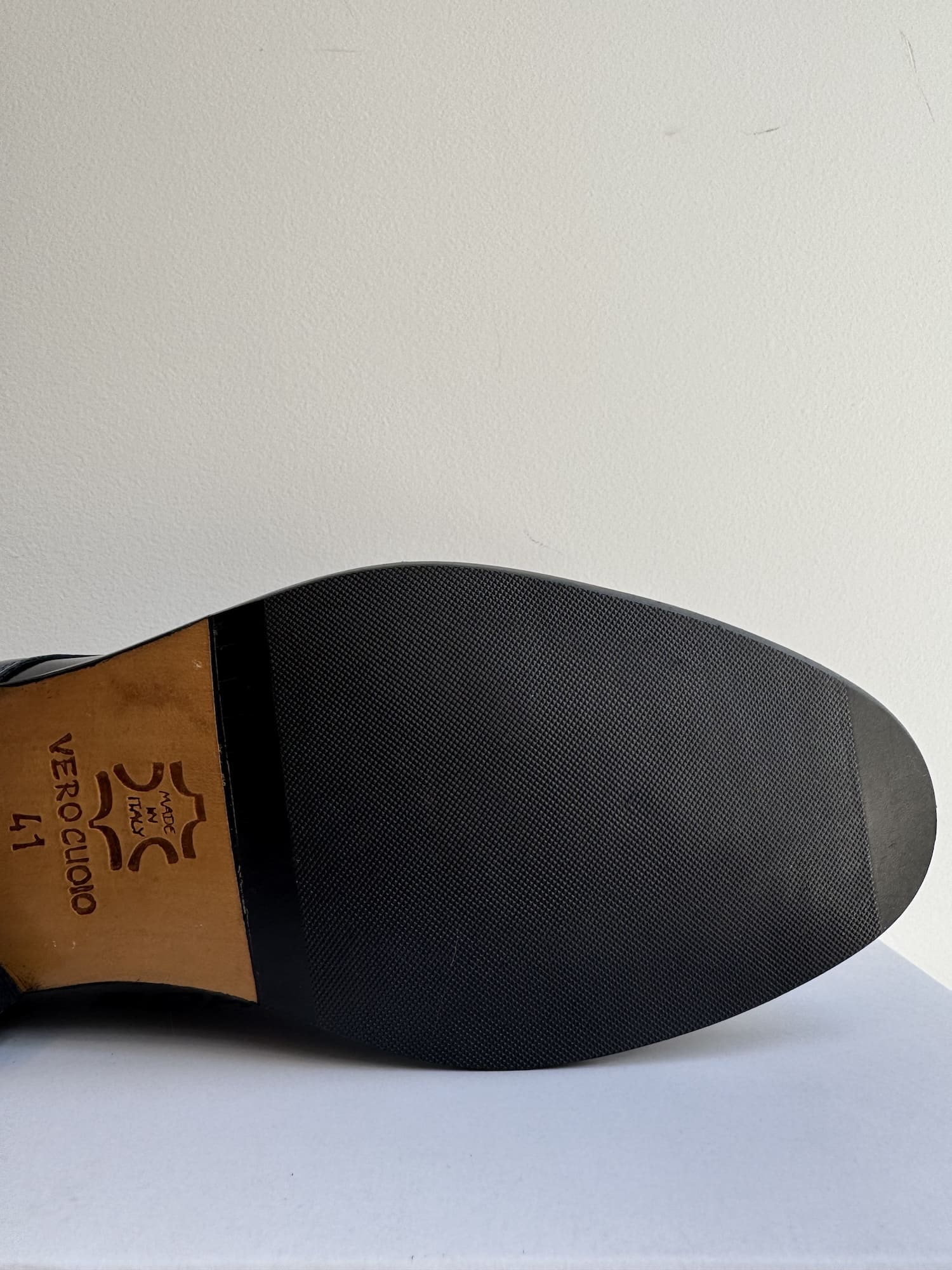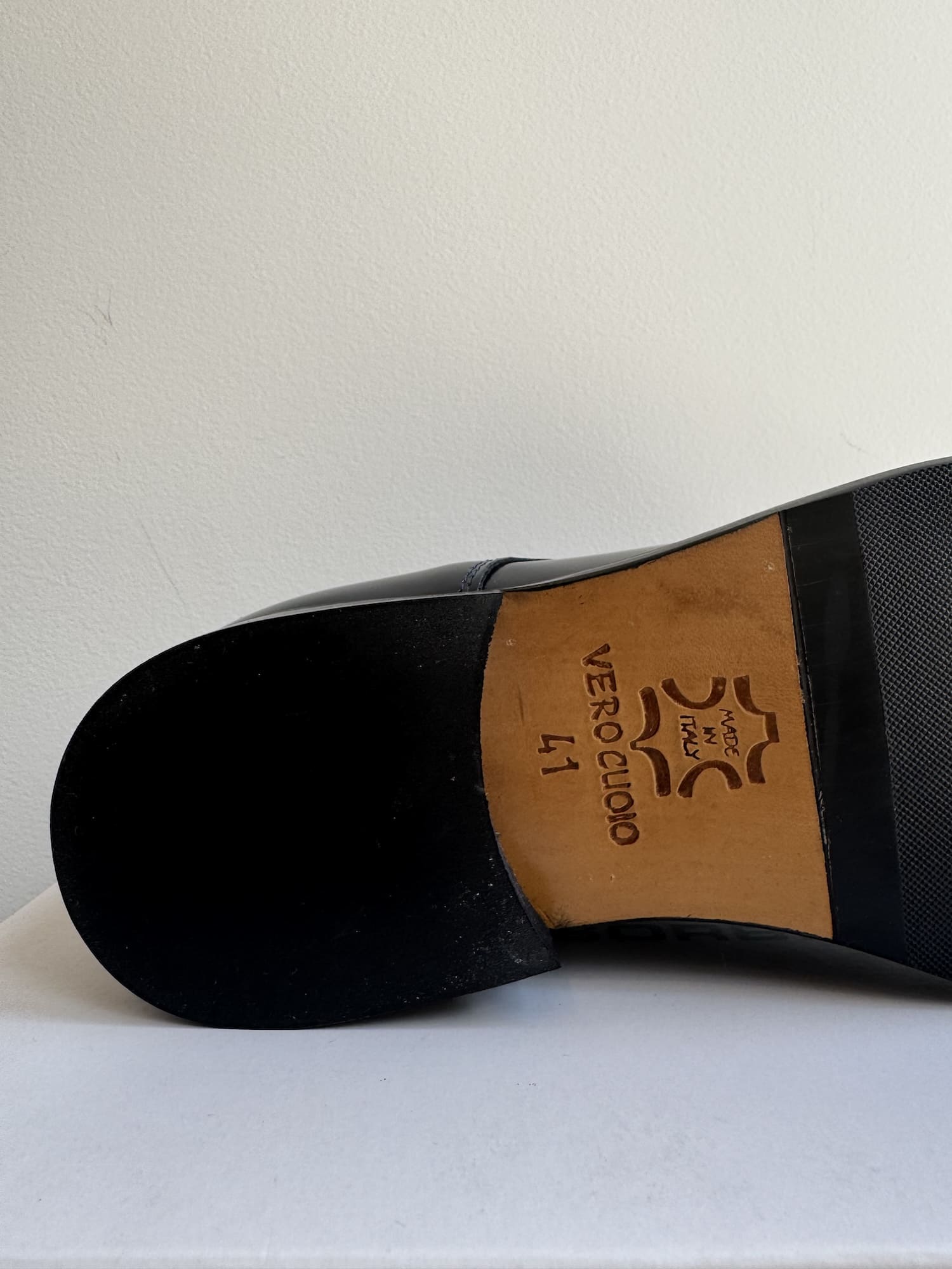 In vera pelle, made in Italy, con fondo in vero cuoio e mezza piantina in gomma anti scivolo.