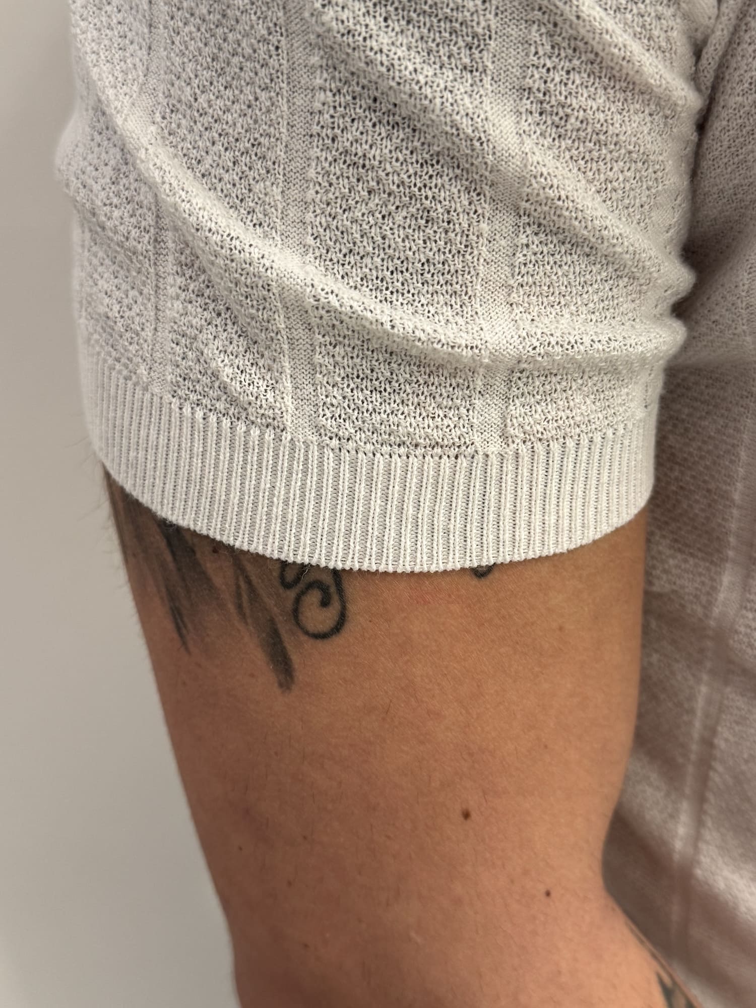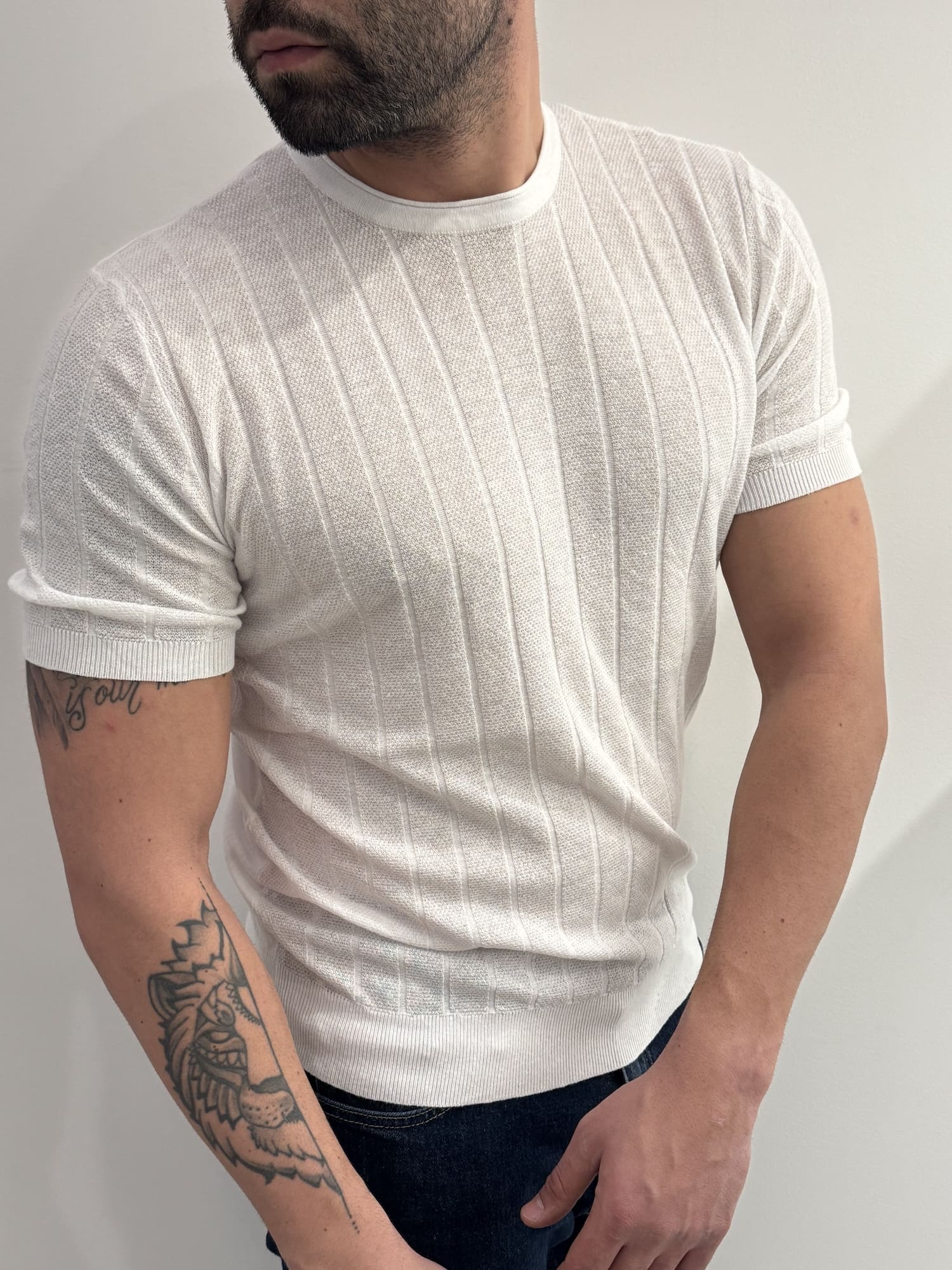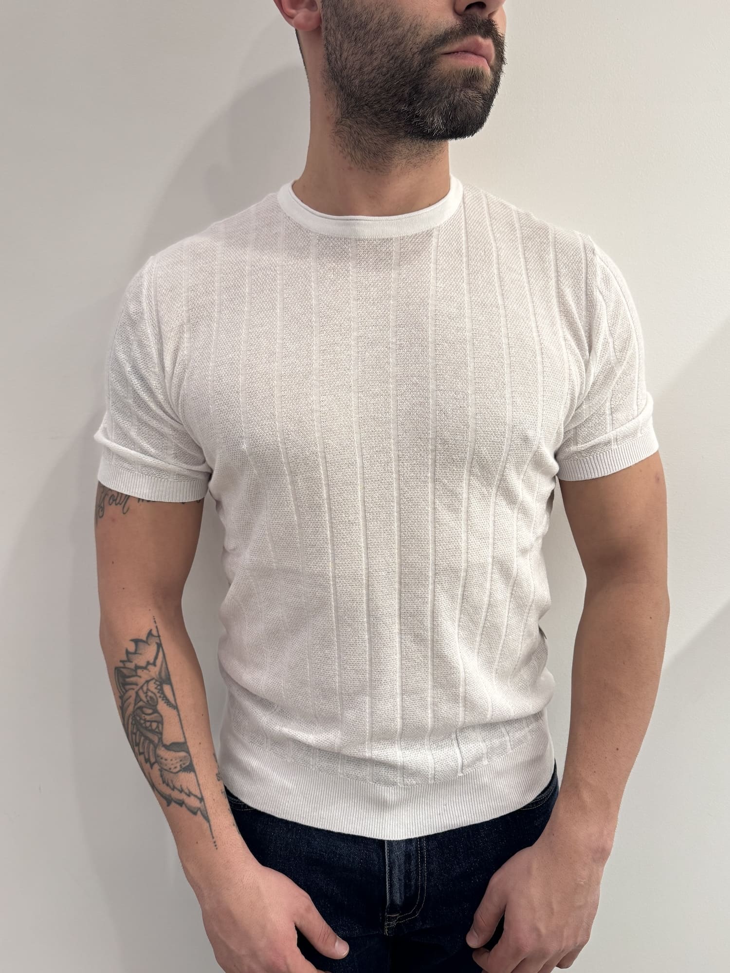 T-shirt in filo a coste misto lino con elastico sui bordi.