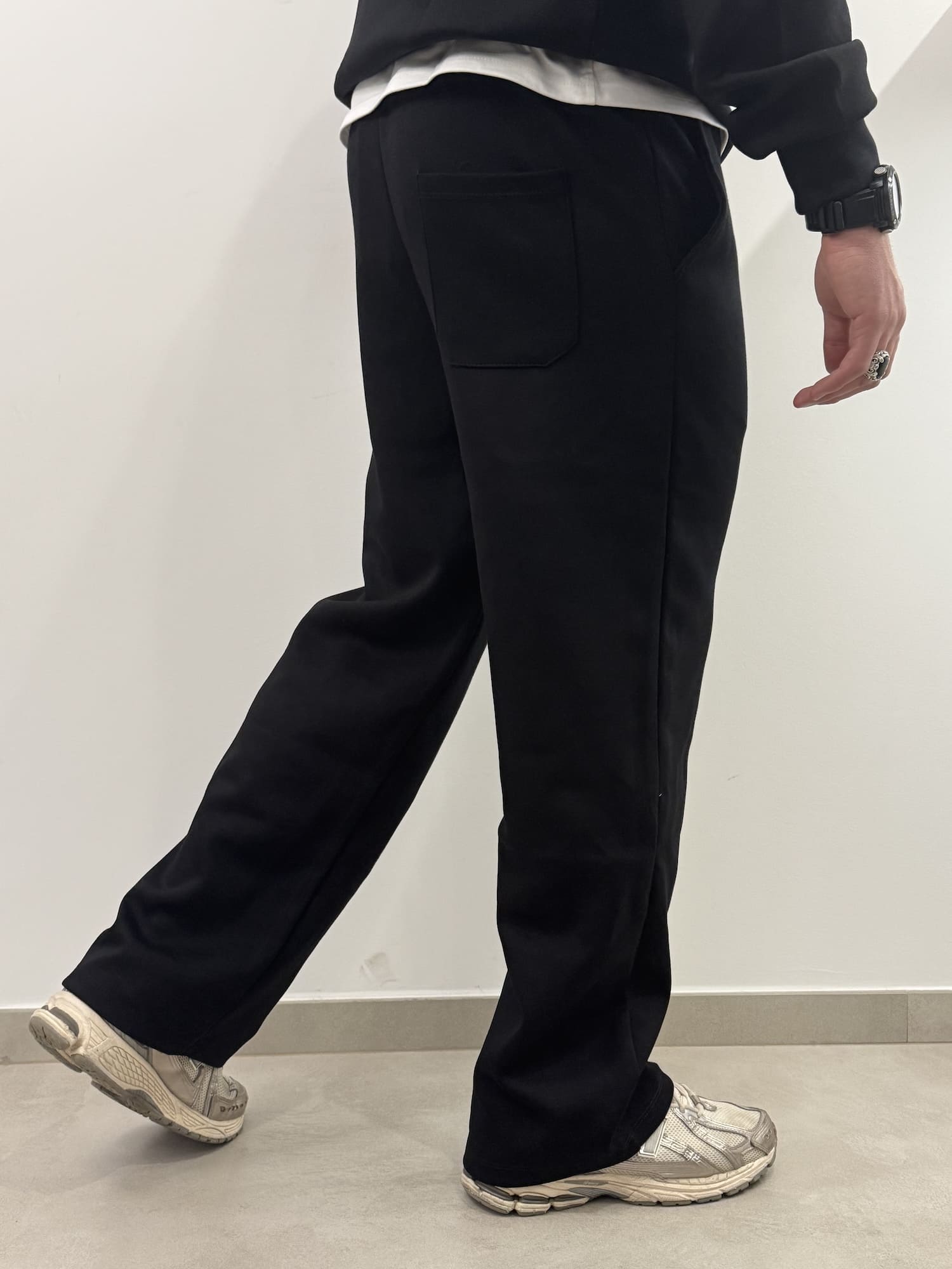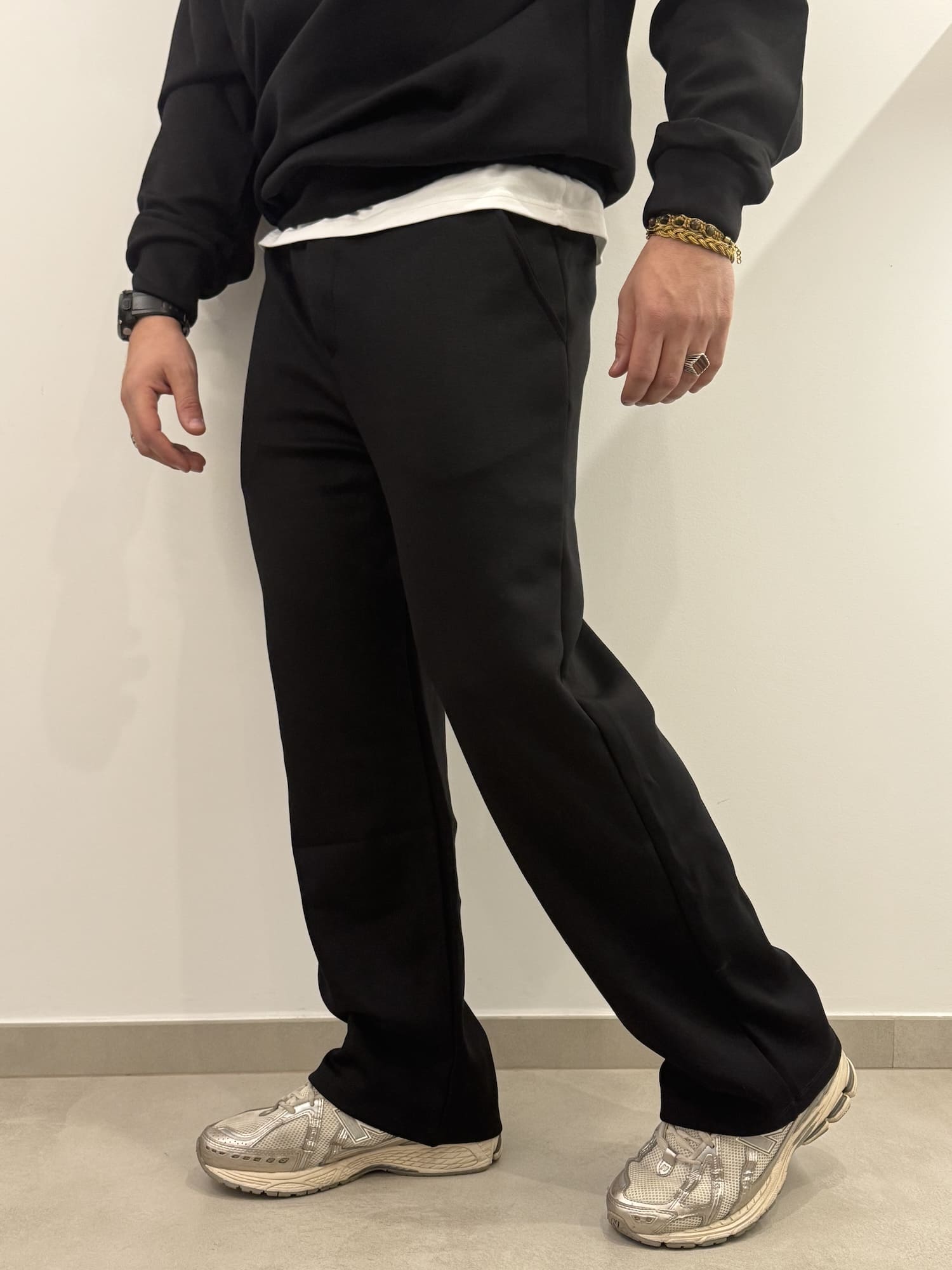 Pantalone con elastico in vita e laccetto regolabile.